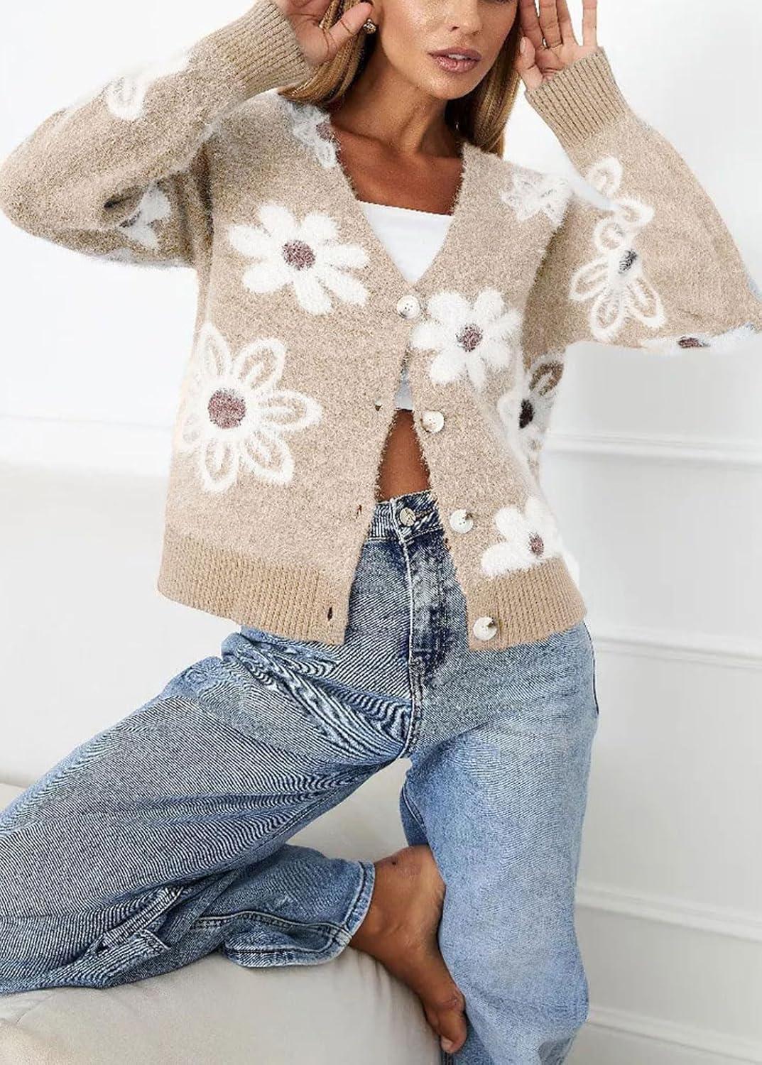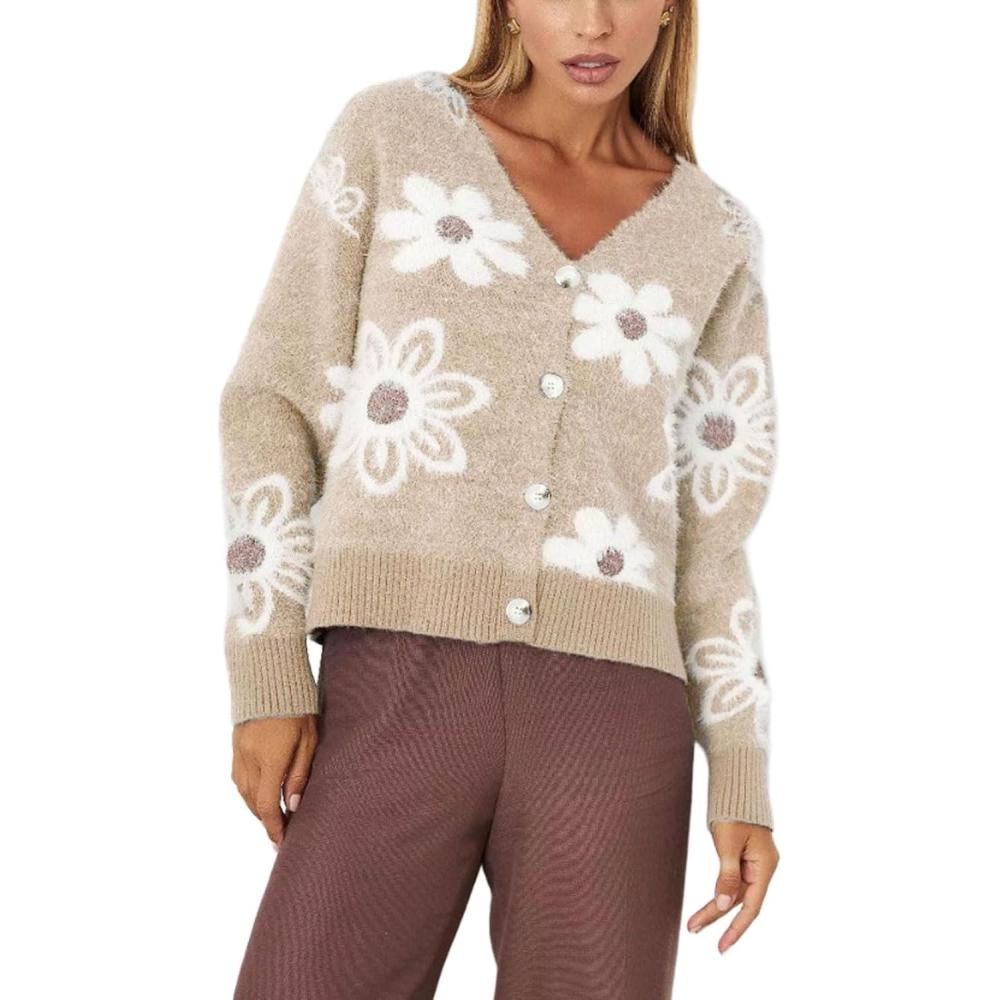 CHARTOU Women V Neck Floral Furry Crop Cardigan Knitted Button Down Cashmere Sweater Fall Outfits(Apricot)