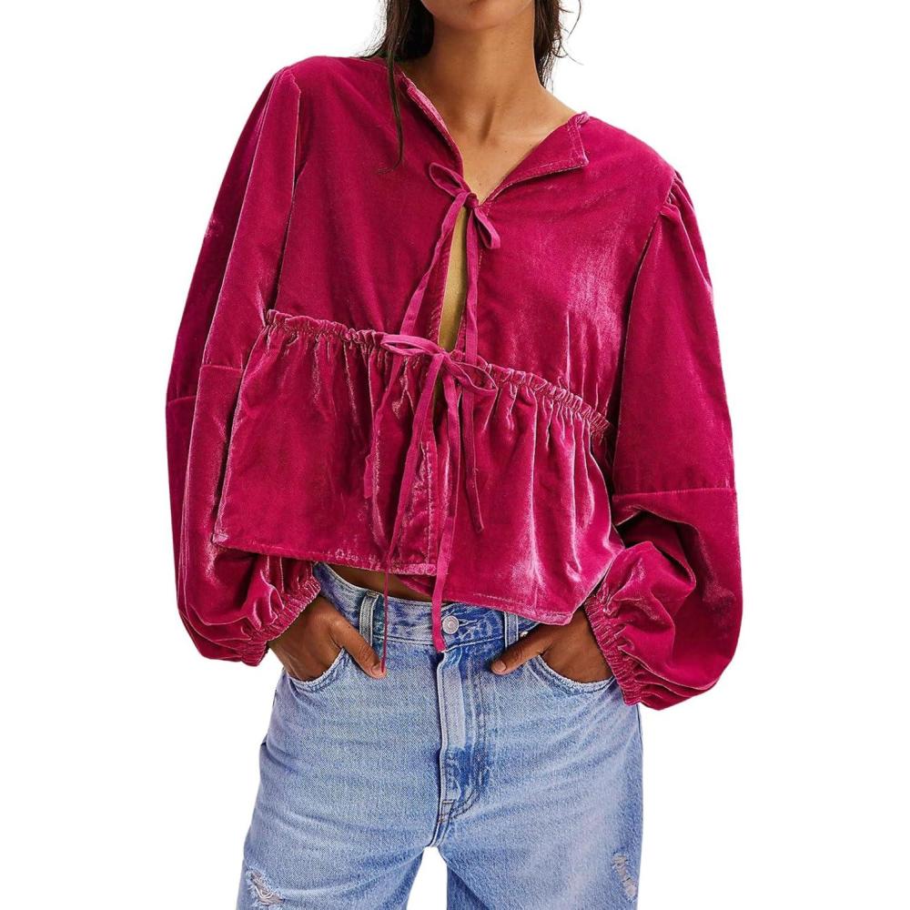 CHARTOU Women Velvet Shirt Tops Cute Bow Tie Front Puff Long Sleeve Blouse Ruffle Lapel Cut Out Fall Outfits(Rose)