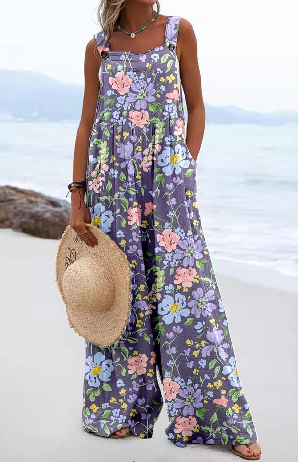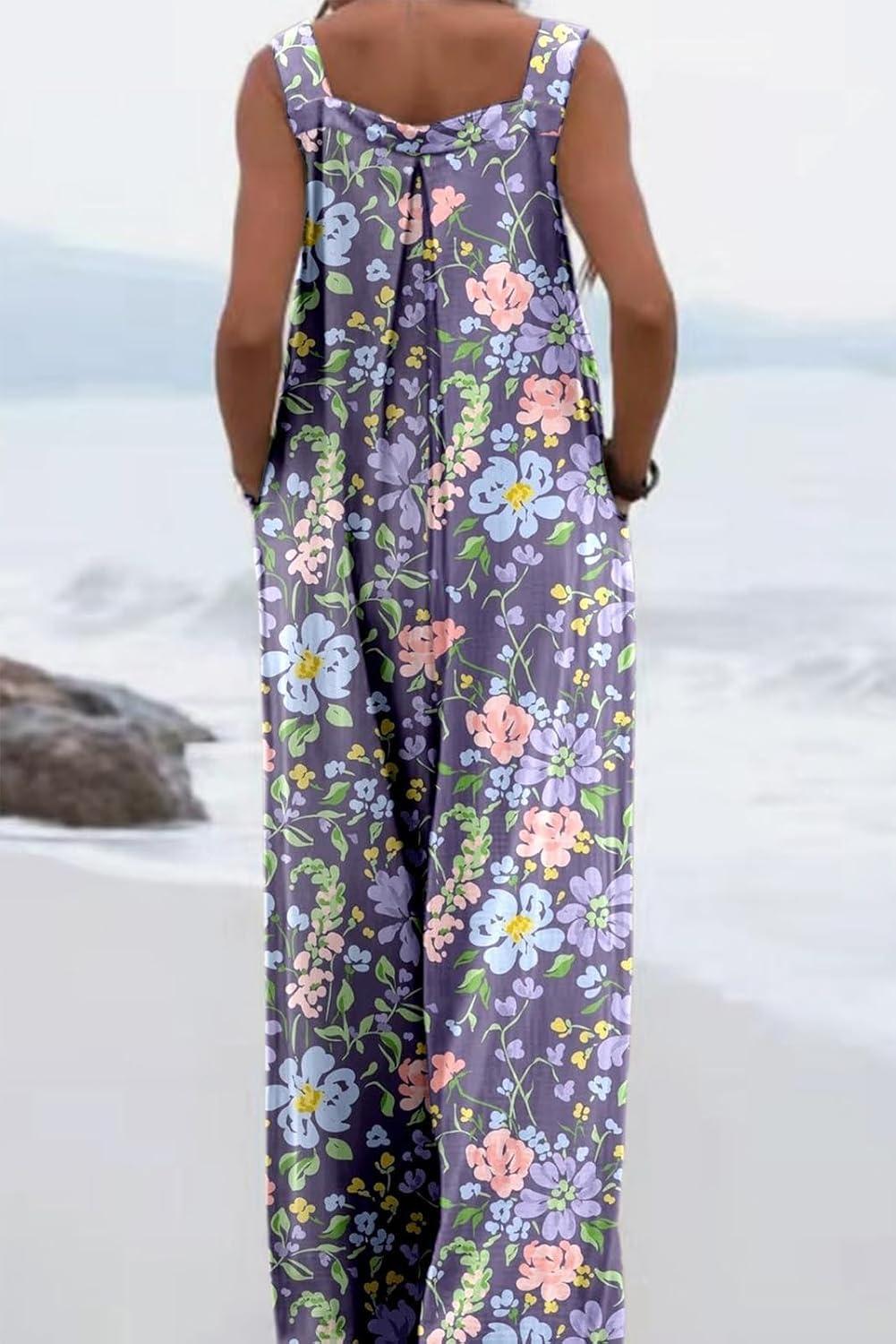 CHARTOU Women Wide Leg Jumpsuit Floral Sleeveless Romper Hippie Pants Boho Summer Flowy Jumpsuit Cargo Overall Pocket(Floral 7)