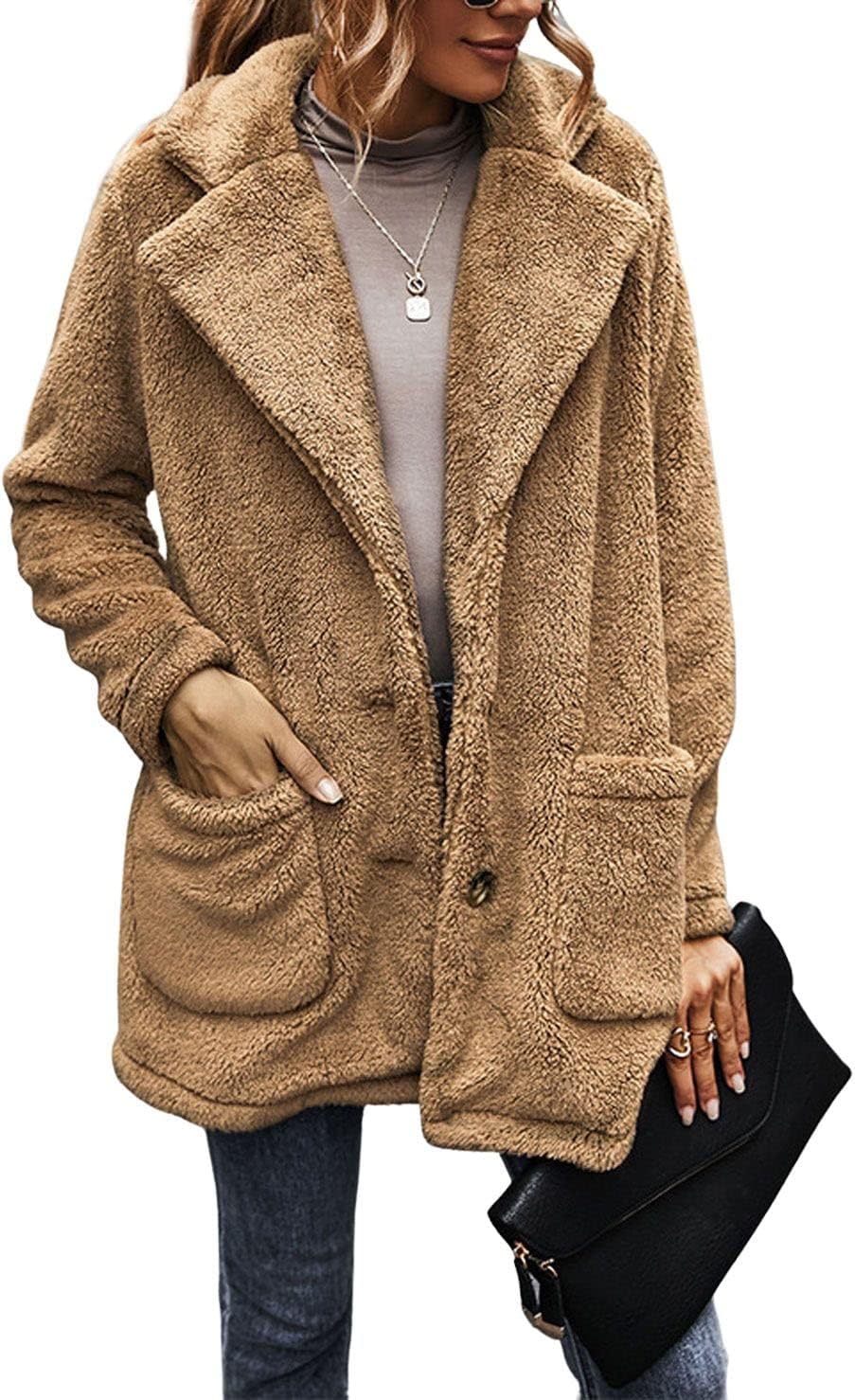 CHARTOU Women Winter Thicken Sherpa Fleece Jacket Fluffy Teddy Bear Coat Faux Fur Shearling Overcoat(Light Khaki)