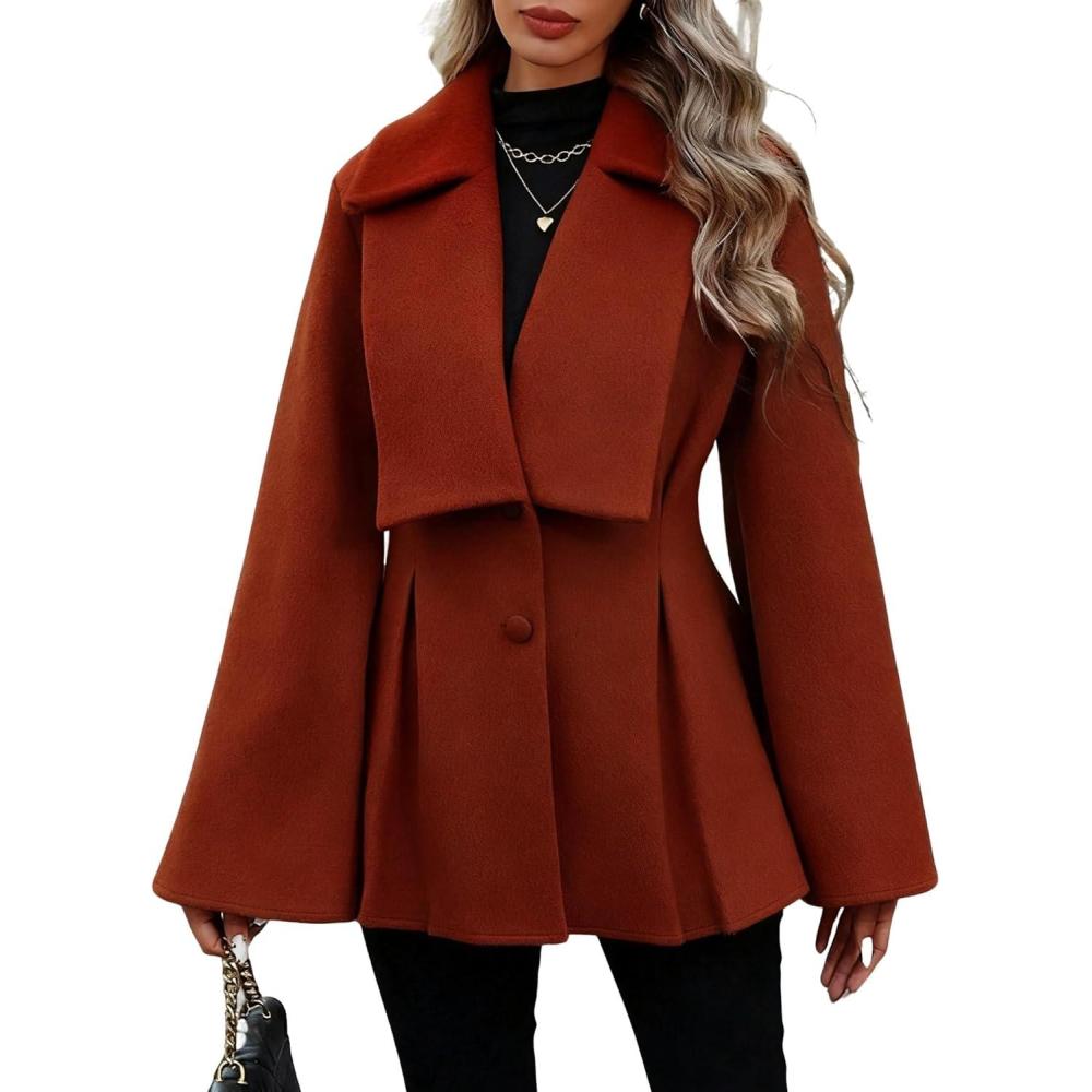 CHARTOU Women Wool Pea Coat Jacket Fall Winter Lapel Flared Long Sleeve Pleated Outwear Trench Overcoat(Dark Brown)
