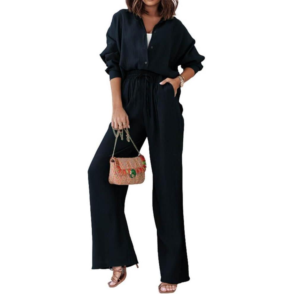 CHARTOU Women’s 2 Piece Outfit Cotton Linen Button Down Shirt Elastic Waist Wide Leg Pants Lounge Set(Black)