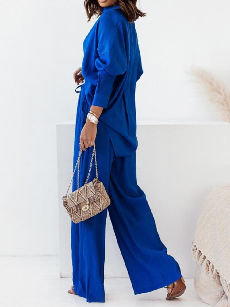 CHARTOU Women’s 2 Piece Outfit Cotton Linen Button Down Shirt Elastic Waist Wide Leg Pants Lounge Set(Blue)