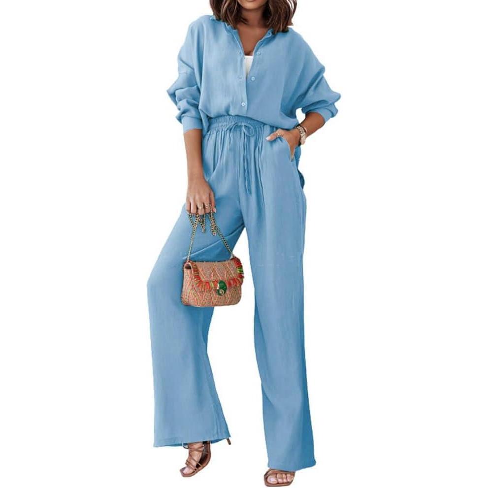 CHARTOU Women’s 2 Piece Outfit Cotton Linen Button Down Shirt Elastic Waist Wide Leg Pants Lounge Set(Light Blue)