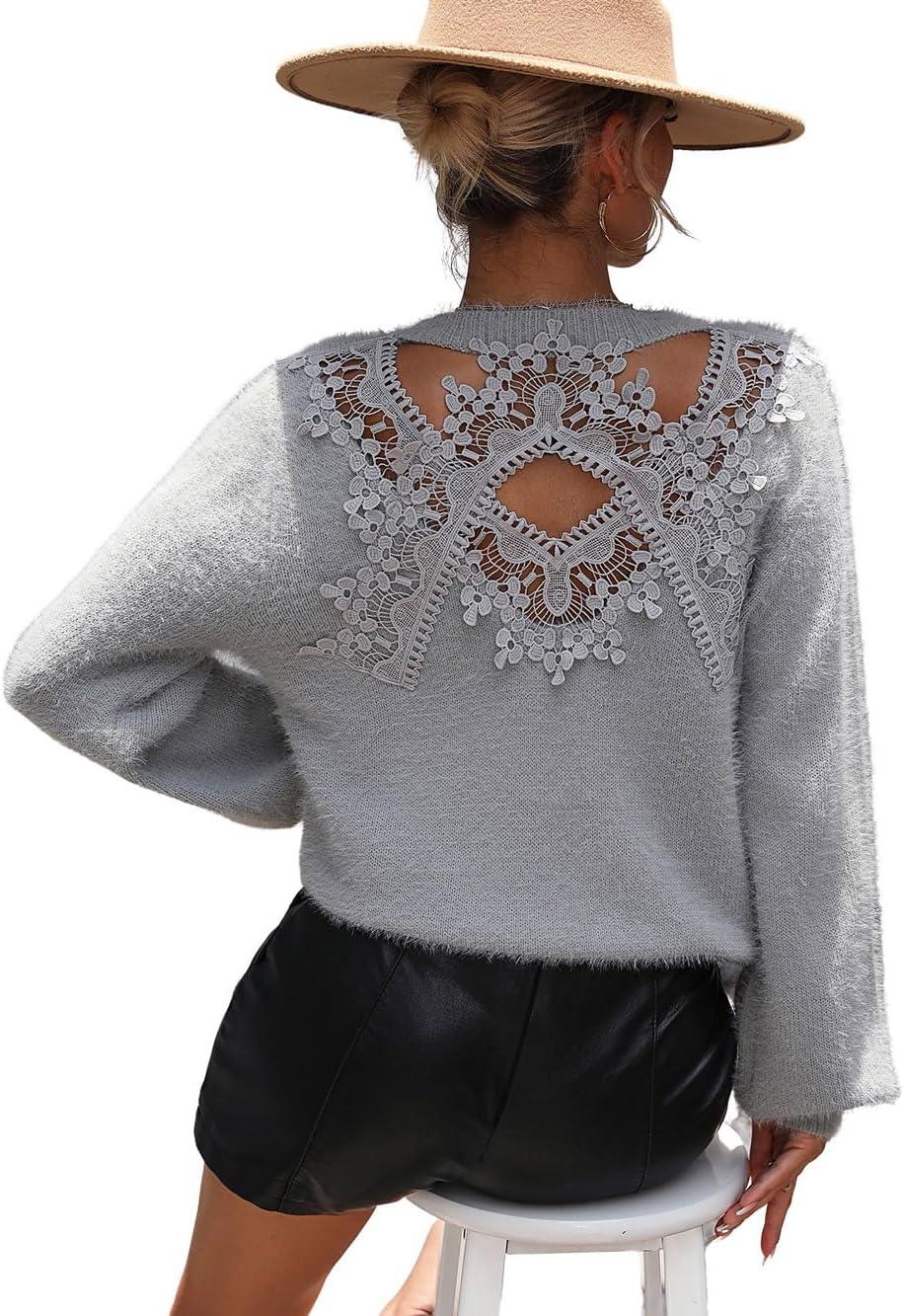 Don’t miss out on our limited-time offer: get a free {accessory} with your purchase of CHARTOU Women’s 2023 Trendy Sexy Back Cut Out Lace Applique Fluffy Knit Pullover Sweater Tops(Grey).