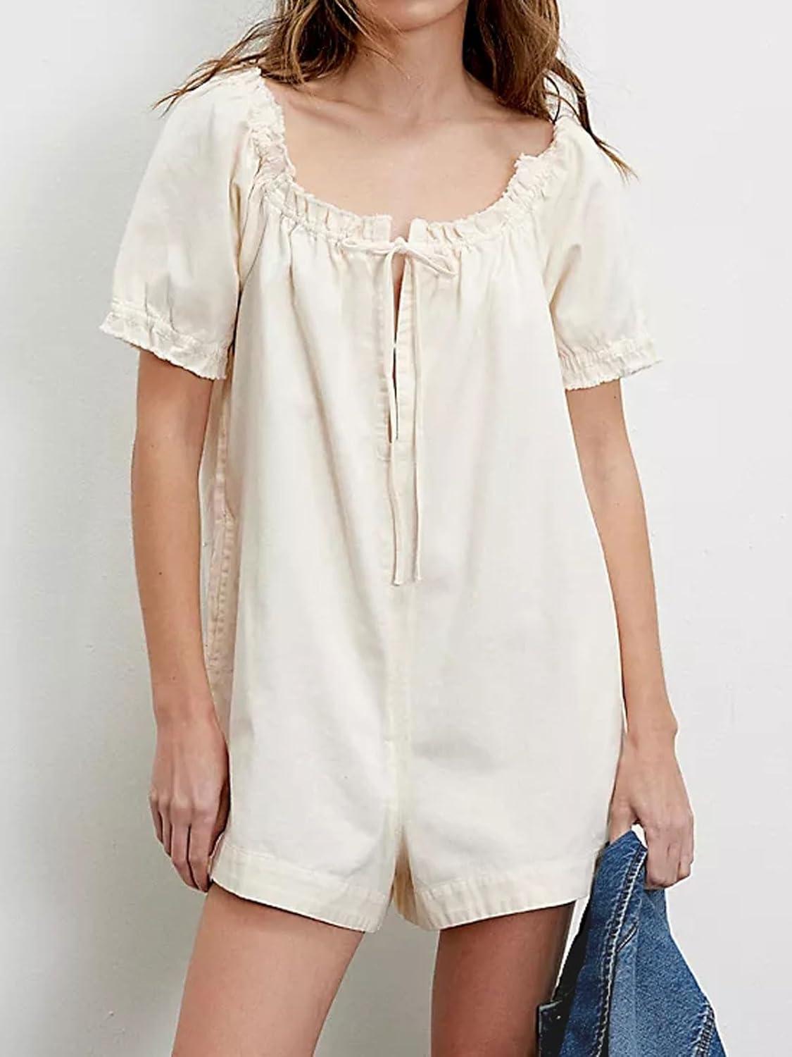 CHARTOU Women’s Babydoll Denim Romper Jumpsuits Short Puff Sleeve Drawstring Jean Overalls Shorts(White)