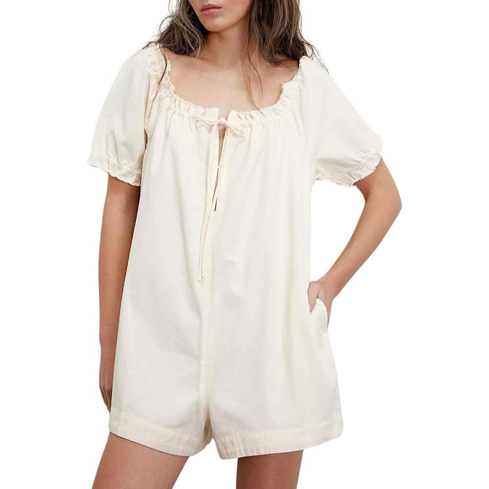 Women's Babydoll Denim Romper Jumpsuits Short Puff Sleeve Drawstring Jean Overalls Shorts Slightly loose fit and baggy style/ Cute babydoll overalls denim shorts relaxed fit/ Summer offer shoulder jean rompers with pockets/ Wide leg shorts jumpsuits for women/ Y2k cowgirl babydoll rompers for women trendy/ Sweet puff sleeve outwears/ Front tie knot romper outfits Square neck lace-up, puff short sleeve, off shoulder, pleated, loose fit, frayed detailing, distressed denim romper women, wide leg jeans shorts, 2 side pockets, retro and vintage, y2k outfits cowgirl rompers, solid color- blue denim rompers womens, black jean shorts women, white babydoll romper overalls Cute babydoll romper women wide neckline that can be worn off the shoulder, sexier and more feminine; Slightly loose fit denim jean romper shorts for women summer relaxed fit for all body type, but not bulky; Distressed fray jean overalls for women add a bit vintage retro cowgirls y2k rompers look Women summer denim rompers with pockets outwears, cute babydoll overall shorts for women dressy streetwear, frayed jean romper for women club party y2k outfits, loose fit puff sleeve romper jumpsuits for women trendy daily wear, picnic and other occasion Women frayed denim romper babydoll overalls jean shorts pockets crewneck puff sleeve short jumpsuits jean rompers loose fit drawstring distressed denim overalls pleated offer shoulder rompers cowgirls one piece jumpsuits retro y2k outfits summer