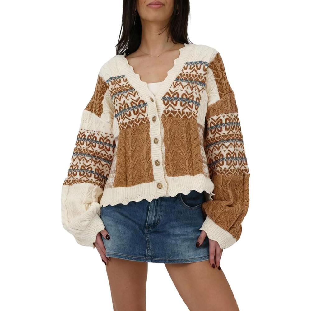 Women's Boho Cropped Cardigan Color Block Short Scalloped V Neck Buttons Knit Fall Sweater Lantern sleeve oversized cardigans for women casual outwear, contrast color patchwork jumper with scalloped trim, button down sweaters, boho knitted cardigan sweaters for women fall fashion knitwear Women crop cardigan open front sweater fall jumper cropped sweater button down cardigans for women cute lantern long sleeve short color block sweaters casual loose knitwear cable knit cardigan brown womens boho cable knit cardigan color block patchwork knitted sweater oversized scalloped V-neck cardigan for women light weight lantern sleeve top red cute sweater y2k navy outerwear casual green fall jumper winter open front short cardigan bohemian style