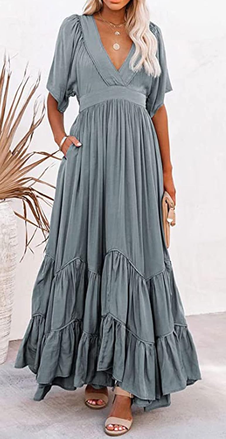 CHARTOU Women’s Boho Ruffle Sleeve Flowy Maxi Dress Lace Up Back Tiered Party A Line Dress(Grey)