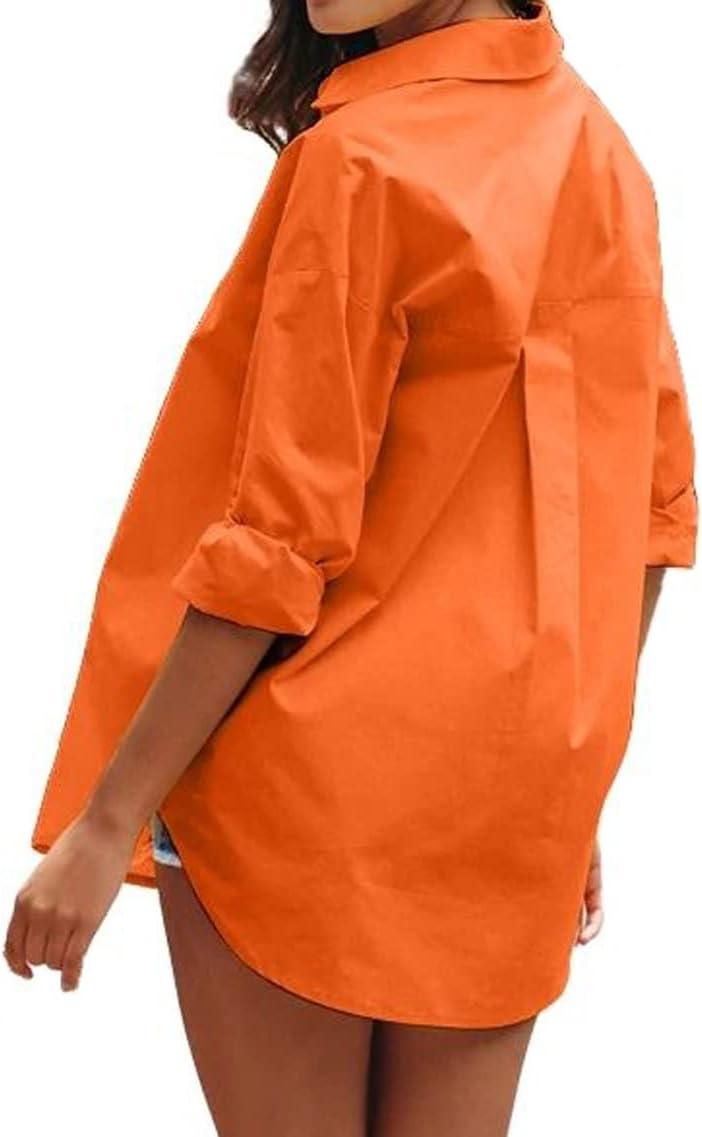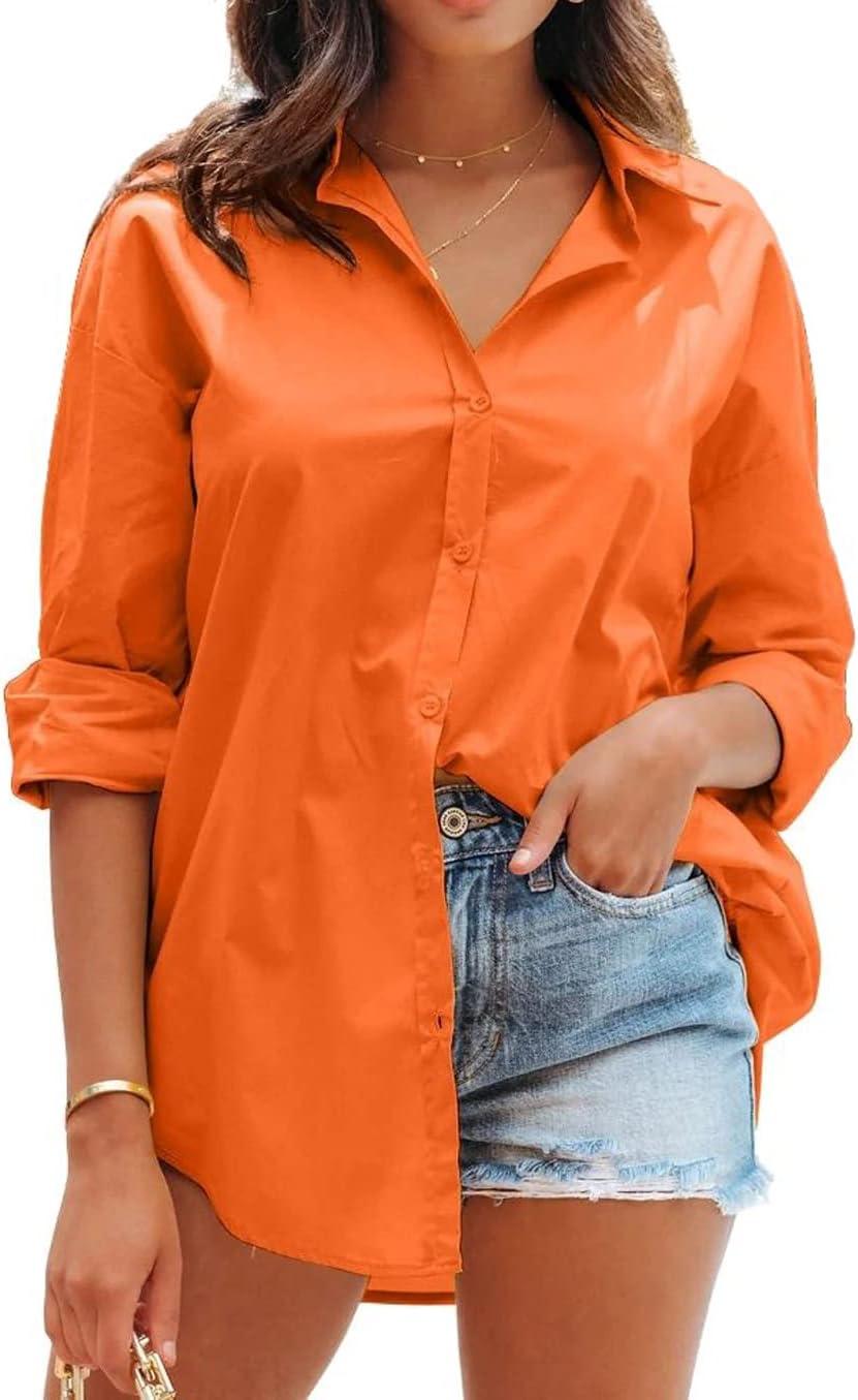 CHARTOU Women’s Boyfriend Style Button Down Long Sleeve Candy Color Blouse Shirt Tops(Orange)