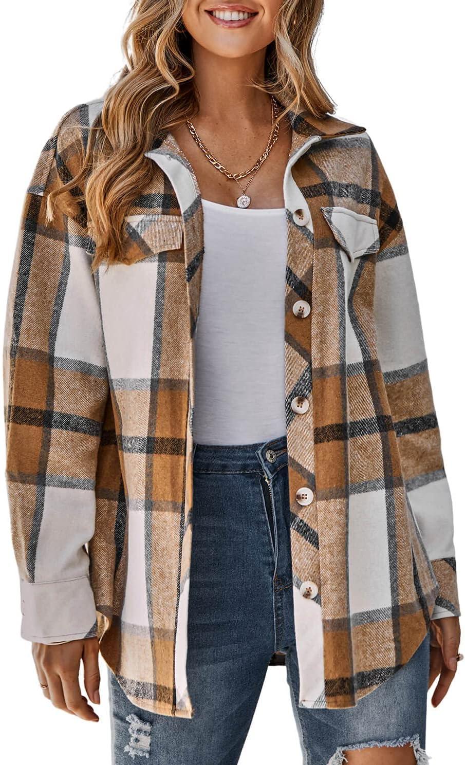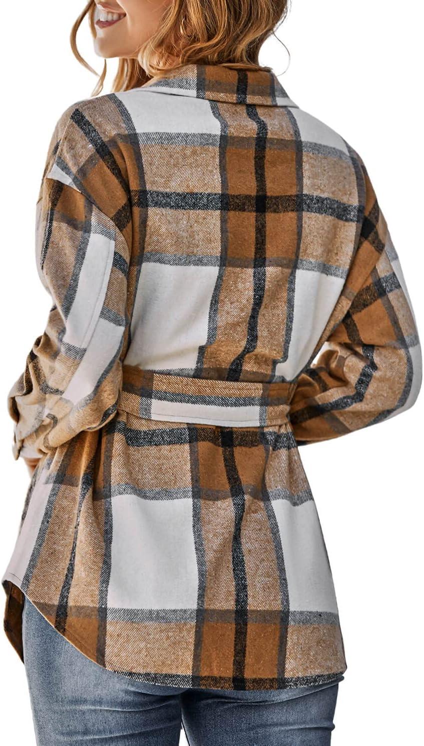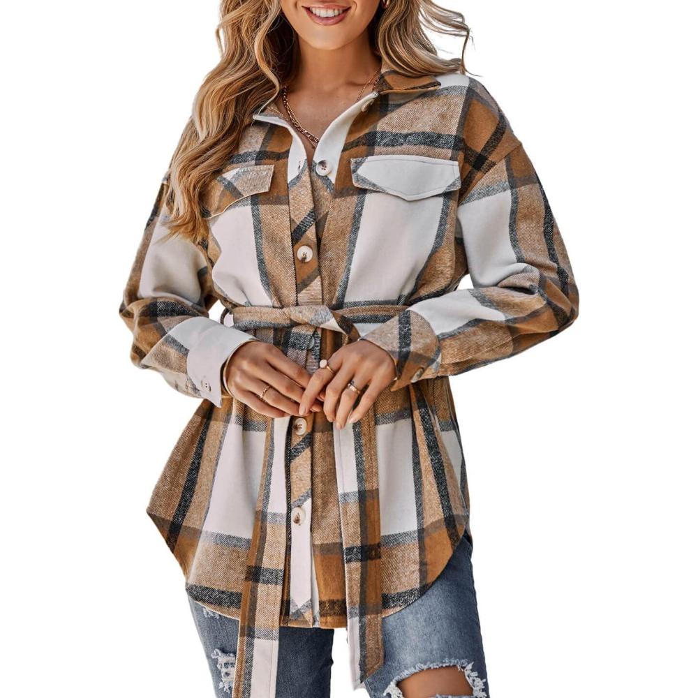 CHARTOU Women’s Brushed Flannel Plaid Oversized Belted Button Down Shirt Shacket(Khaki)