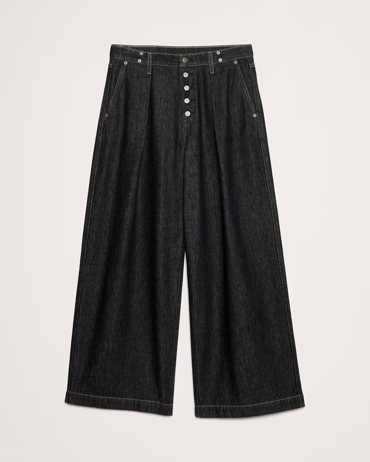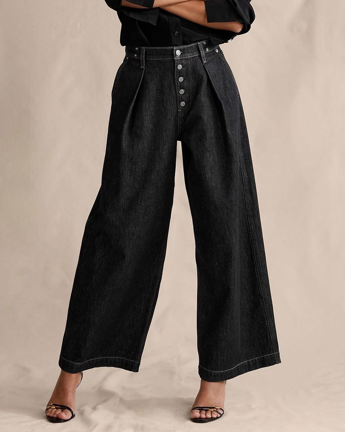 CHARTOU Womens Button Up Baggy Jeans Casual Straight Wide Leg Denim Pants Pleated High Rise Cropped Jeans(Black)