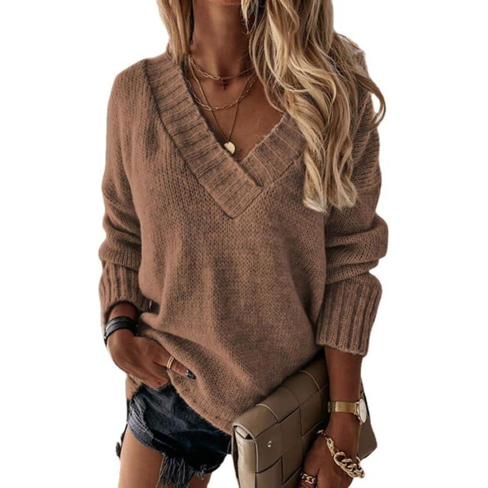 CHARTOU Women’s Casual Fall Long Sleeve Sweater V-Neck Ribbed Knitted Loose Pullover Jumper(Coffee)