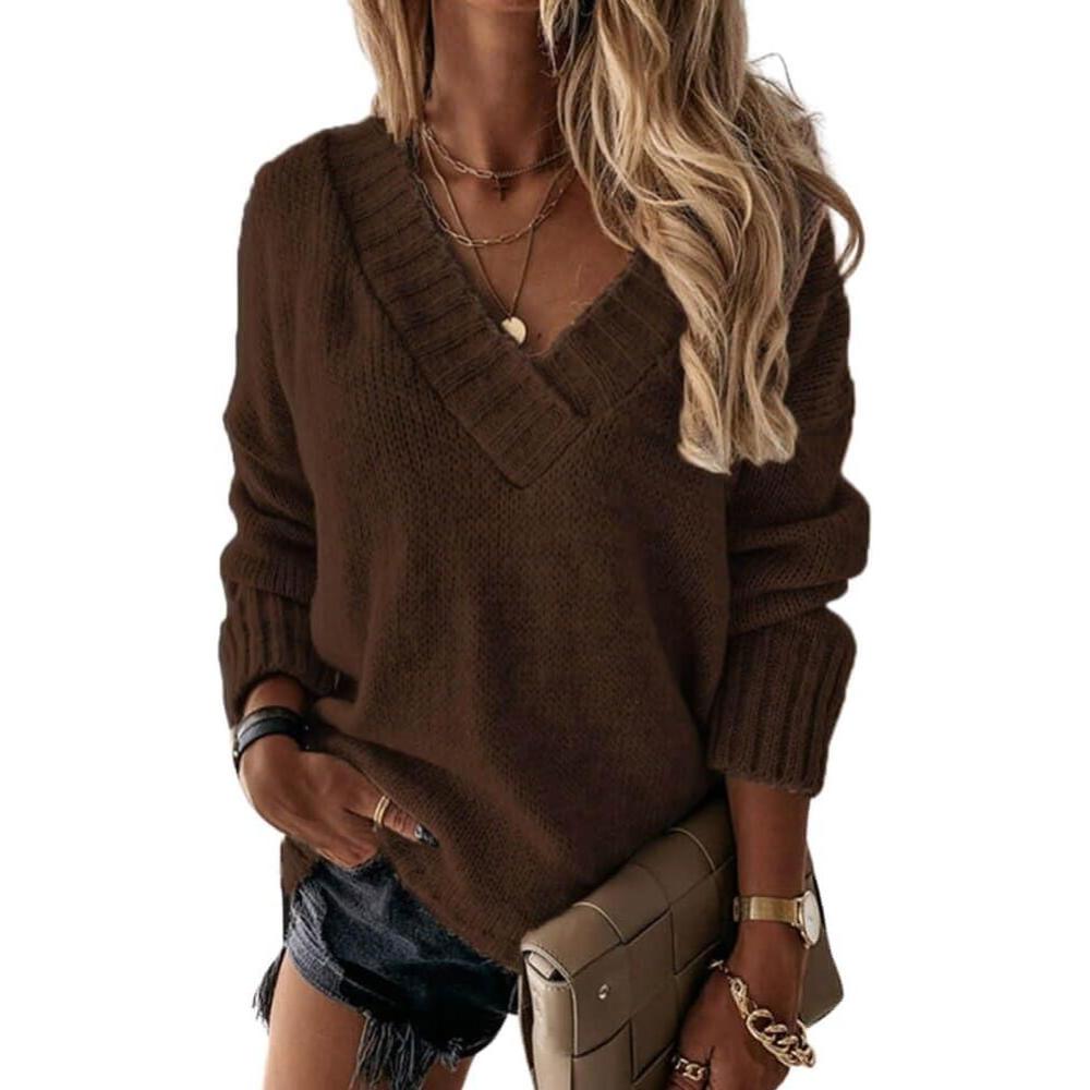 CHARTOU Women’s Casual Fall Long Sleeve Sweater V-Neck Ribbed Knitted Loose Pullover Jumper(Dark Brown)