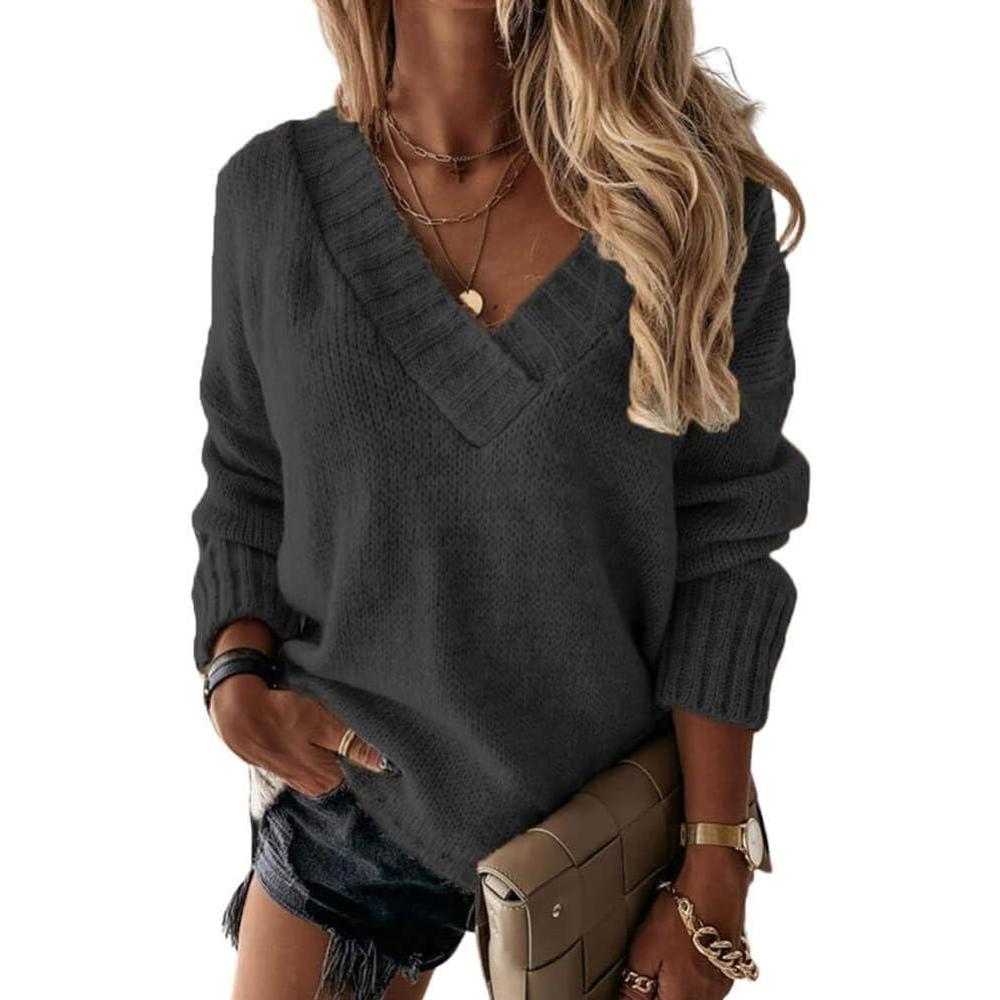 CHARTOU Women’s Casual Fall Long Sleeve Sweater V-Neck Ribbed Knitted Loose Pullover Jumper(Dark Grey)