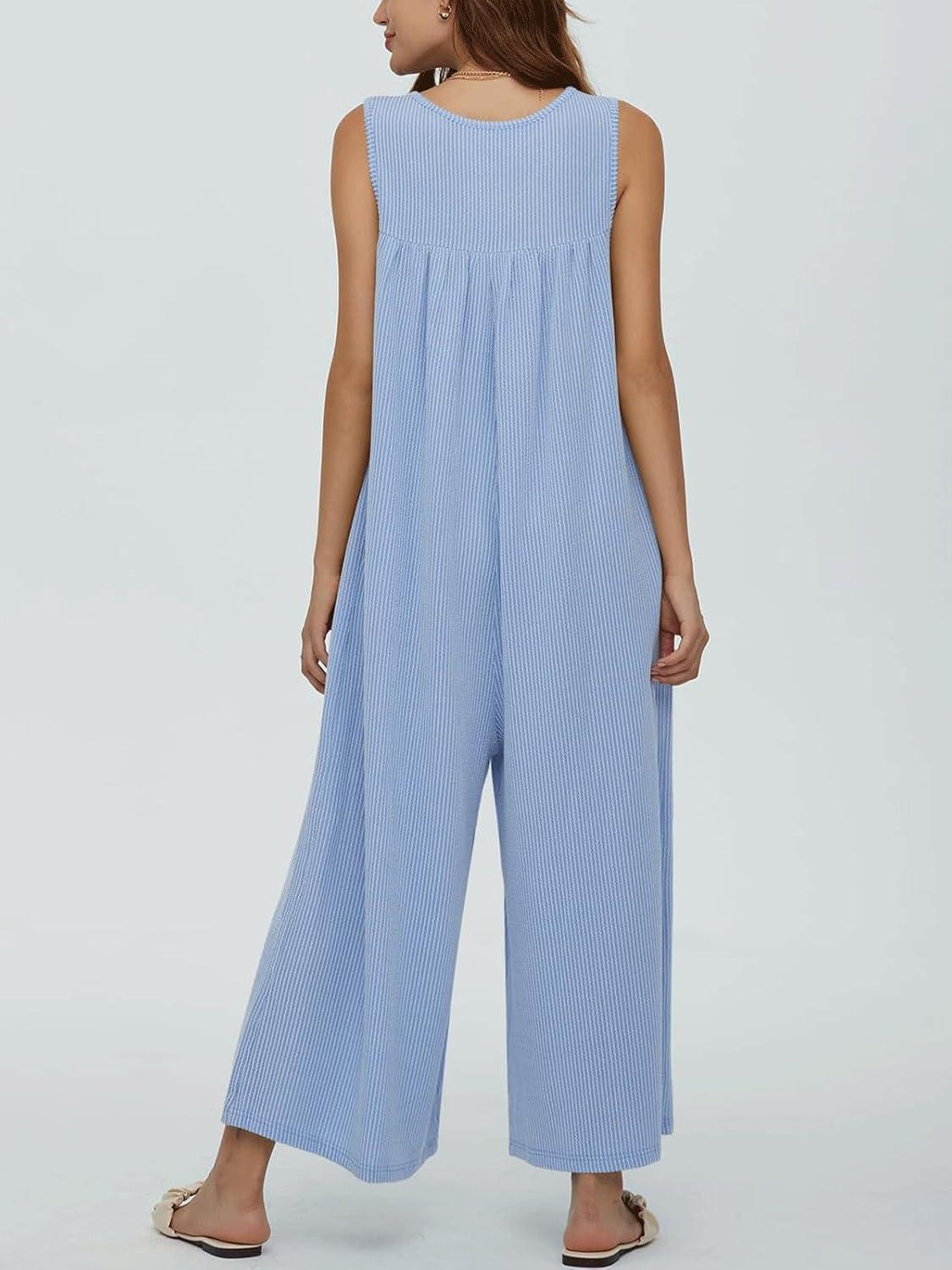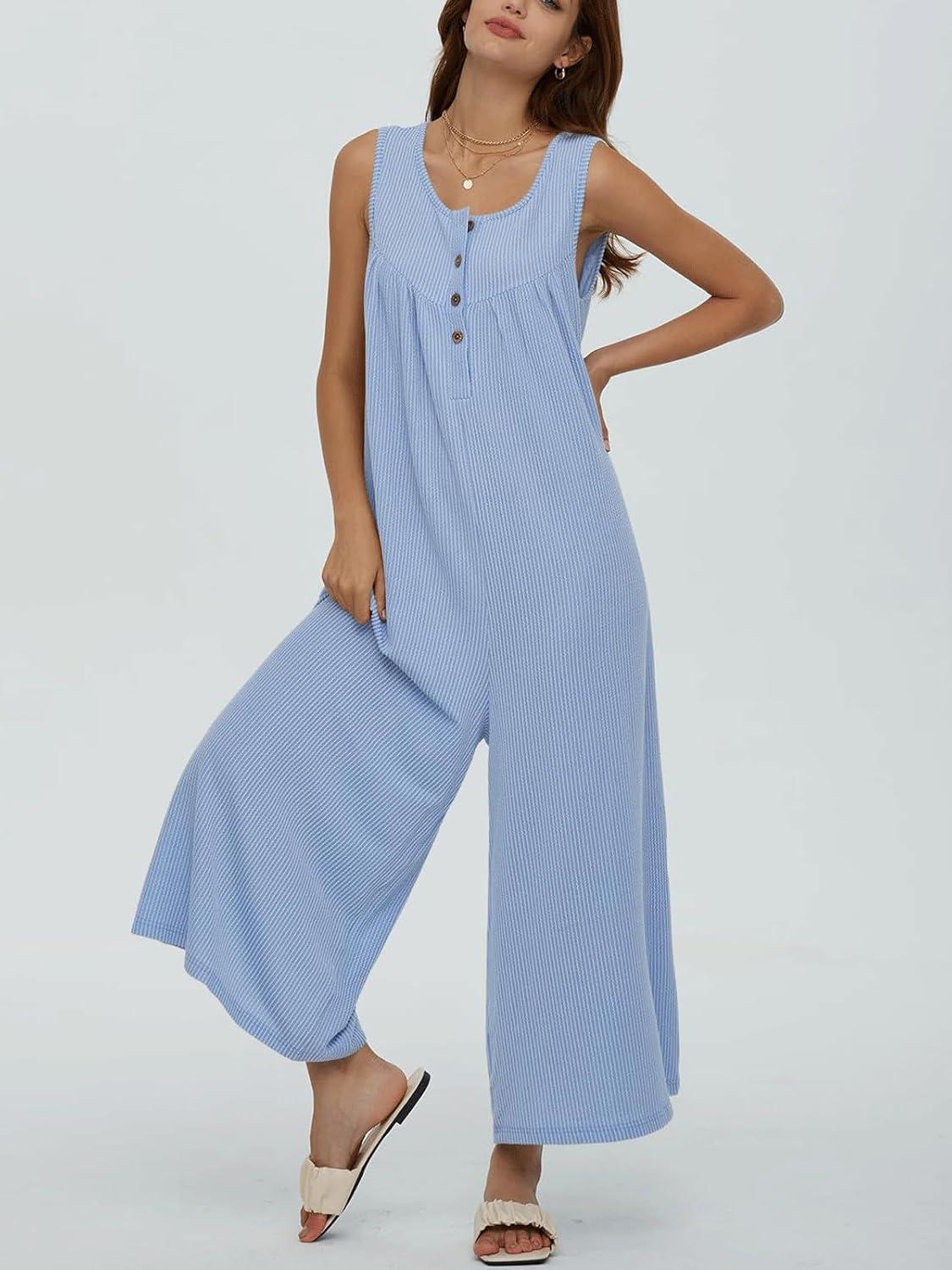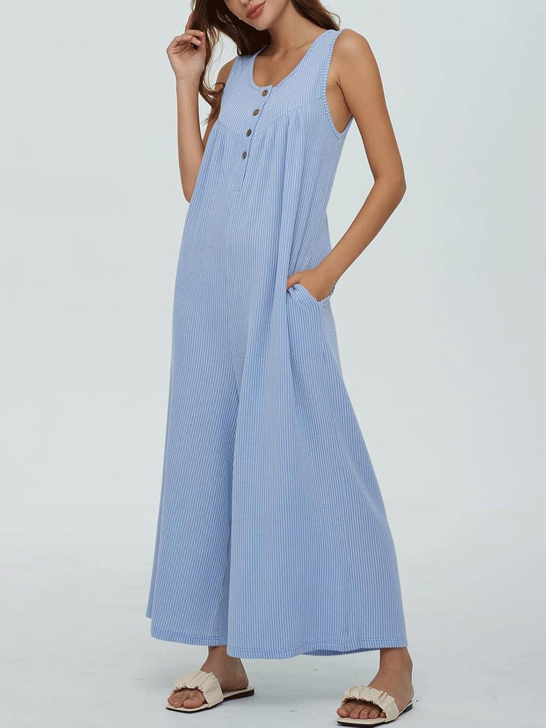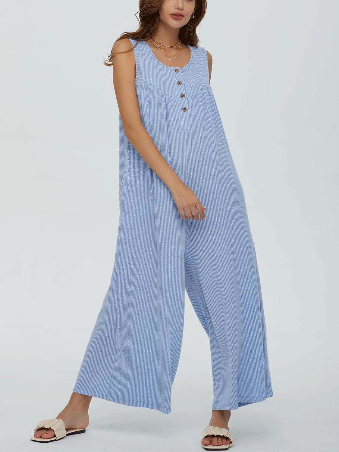 CHARTOU Women’s Casual Loose Ribbed Overalls Jumpsuits Sleeveless Button Romper Wide Leg Pants Flowy(Blue)