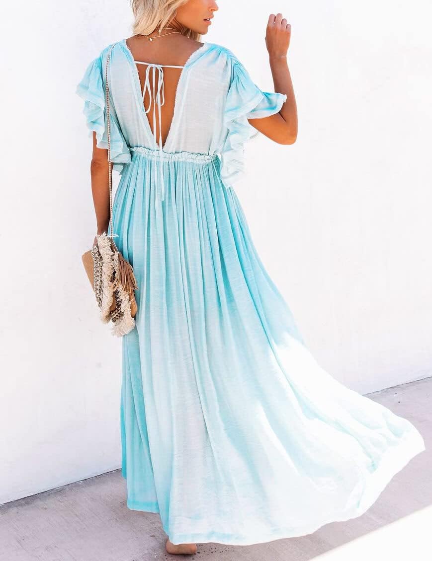 Be the first to review “CHARTOU Women’s Casual Plunging V Neck Backless Ruffle Short Sleeve Button Down Pleated Flowy Beach Maxi Dress(Light Blue)” Cancel reply