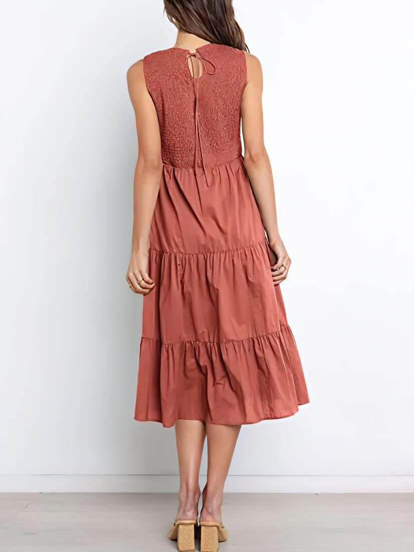 CHARTOU Women’s Casual Sleeveless Smocked Crew Neck Tiered Ruffle Flowy Swing Midi Dress(Brick Red)