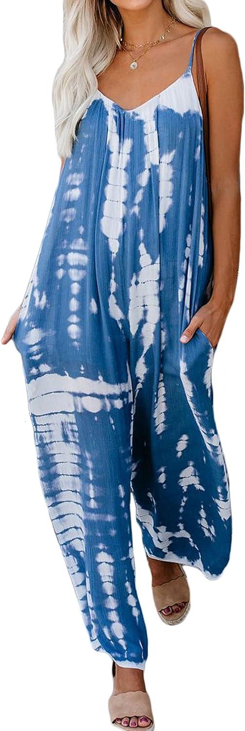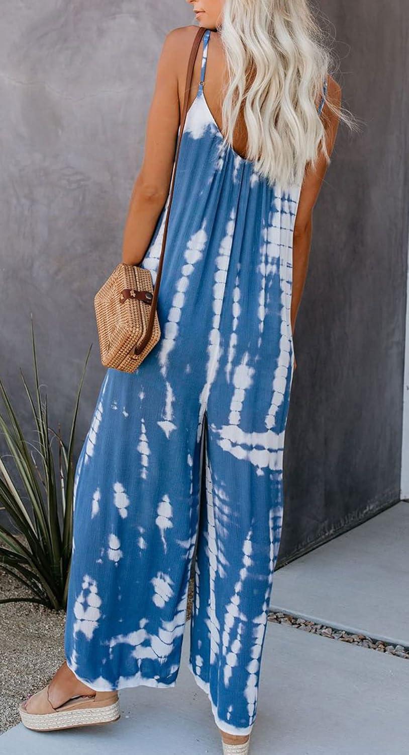 CHARTOU Women’s Casual Spaghetti Strap Jumpsuit Tie Dye Print Flowy Wide Leg Romper with Pocket(Blue)