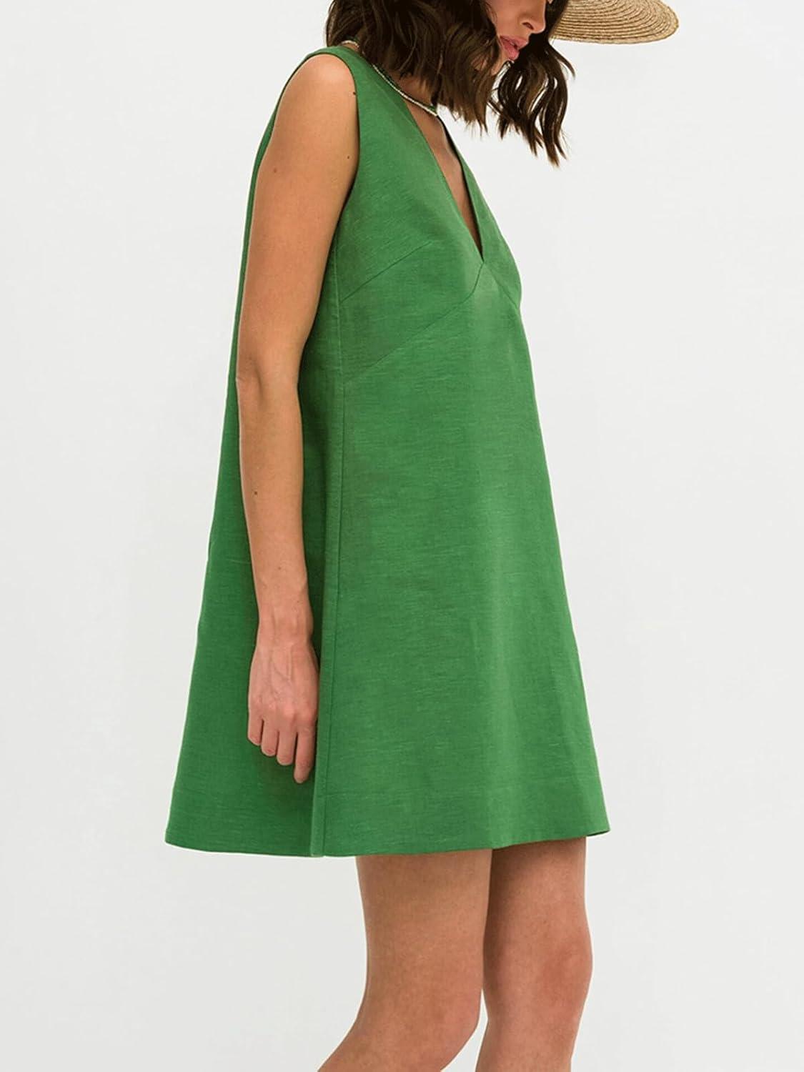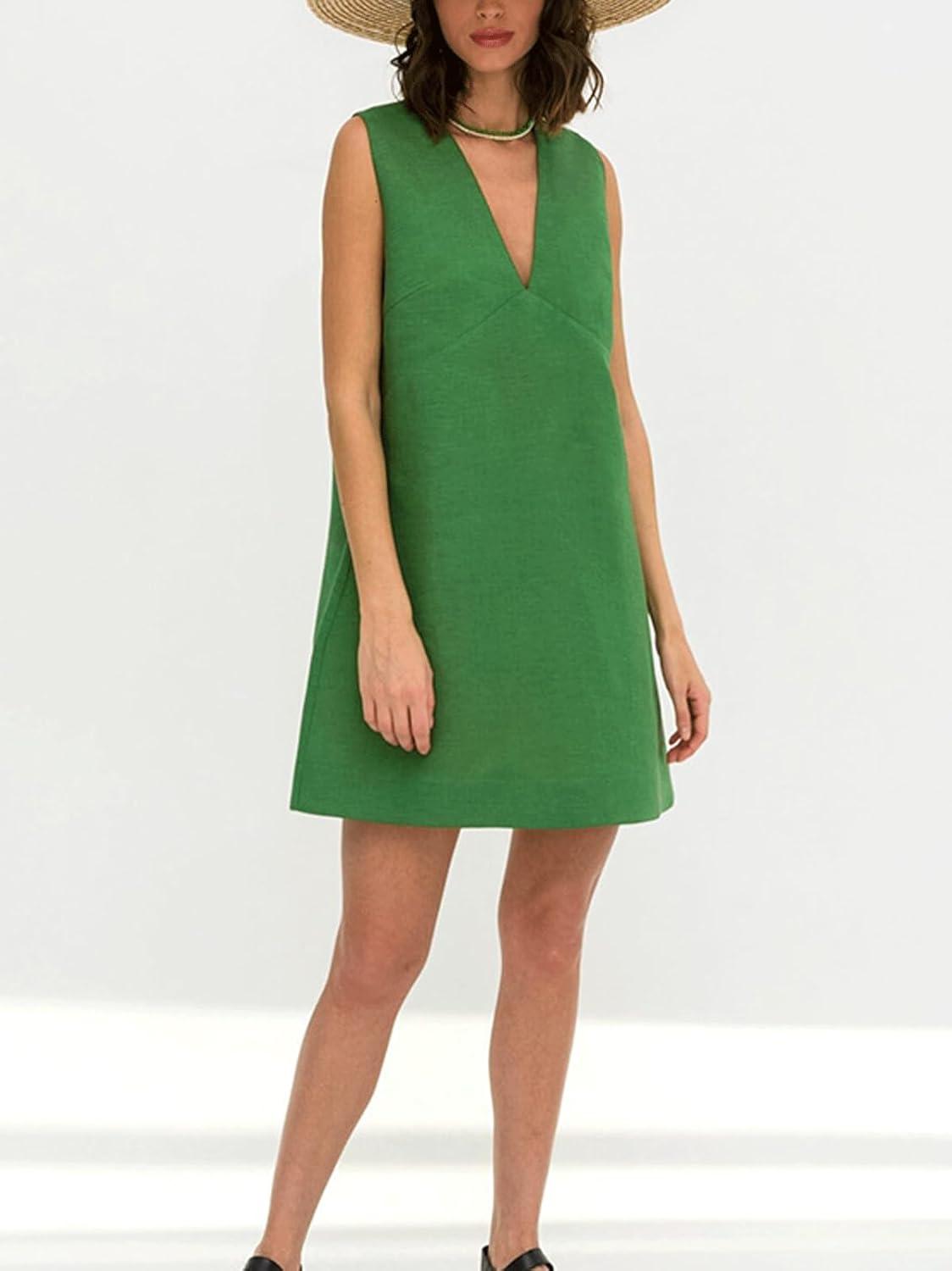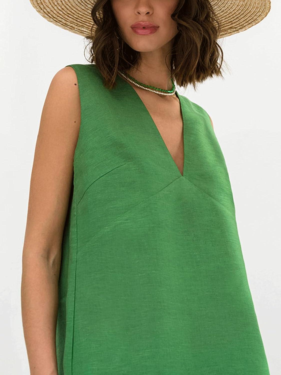 CHARTOU Womens Casual Vest Short Dress Cotton Linen V Neck Sleeveless A Line Mini Dress Loose Solid Sundress(Green)