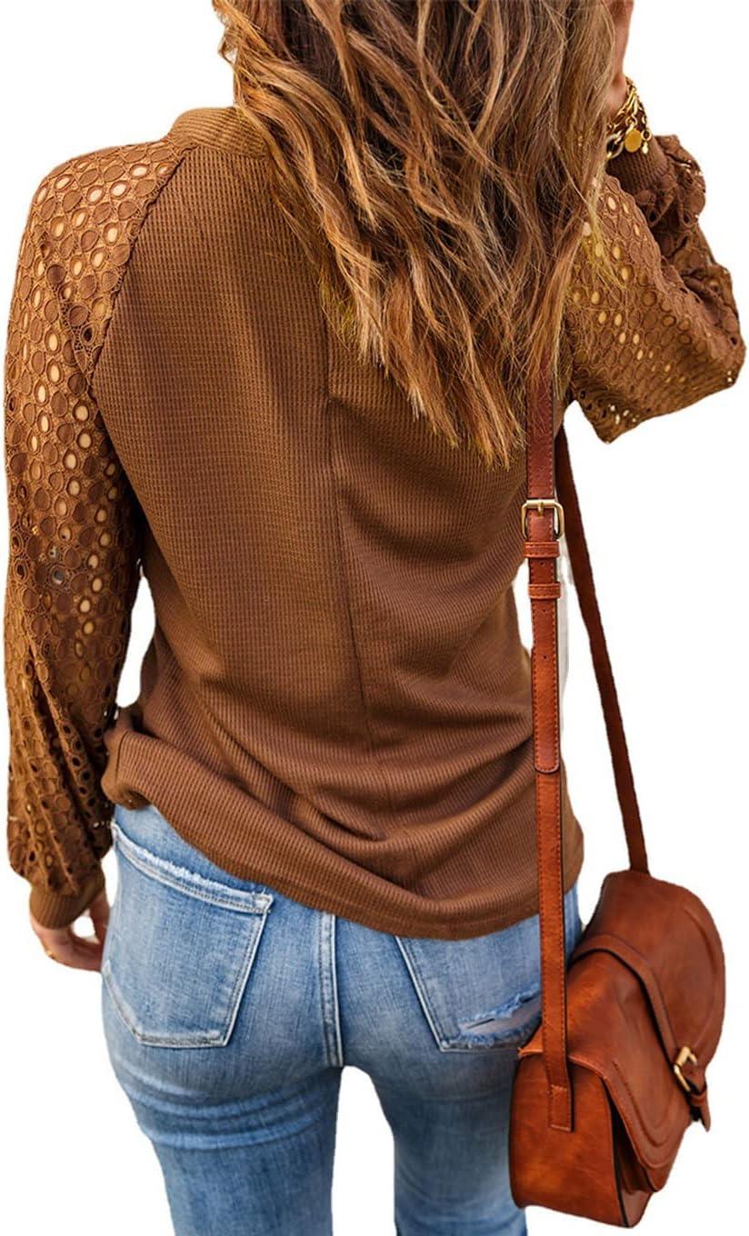 CHARTOU Women’s Causal Round Neck Waffle Knit Raglan Sleeve Lace Patchwork Pullover T-Shirt(Brown)