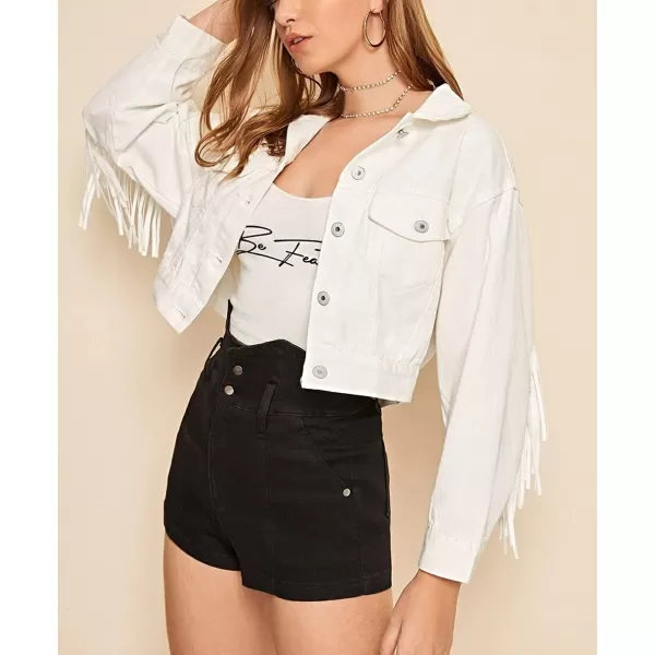 CHARTOU Women’s Chic Button Down Tassel Fringe Denim Jean Cropped Jacket(White)