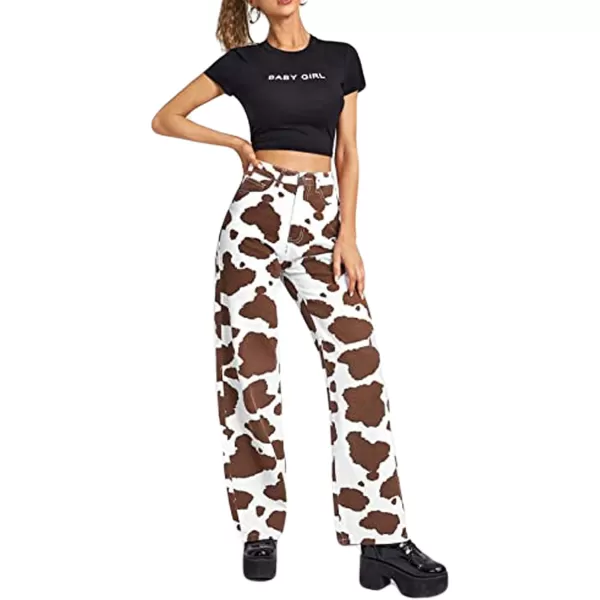 CHARTOU Women’s Chic High Rise Straight Leg Bootcut Cow Print Denim Pants Jeans(Brown)