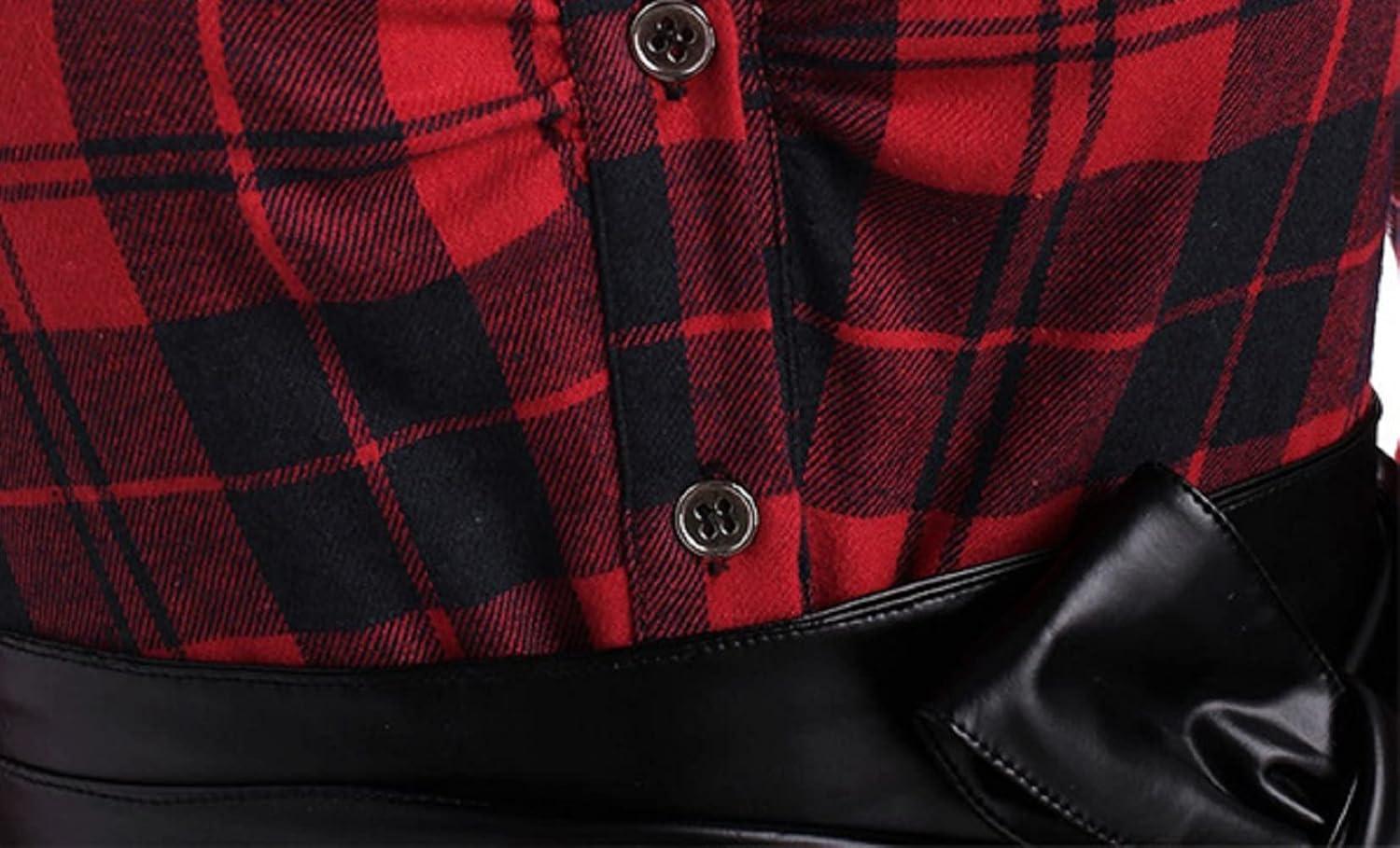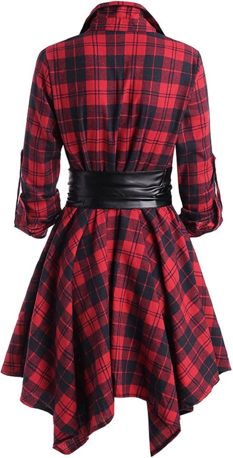 CHARTOU Women’s Chic Spread Collar High Waist Belt Plaid Irregular A-Line Midi Blouse Dress(Red)