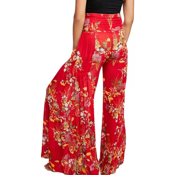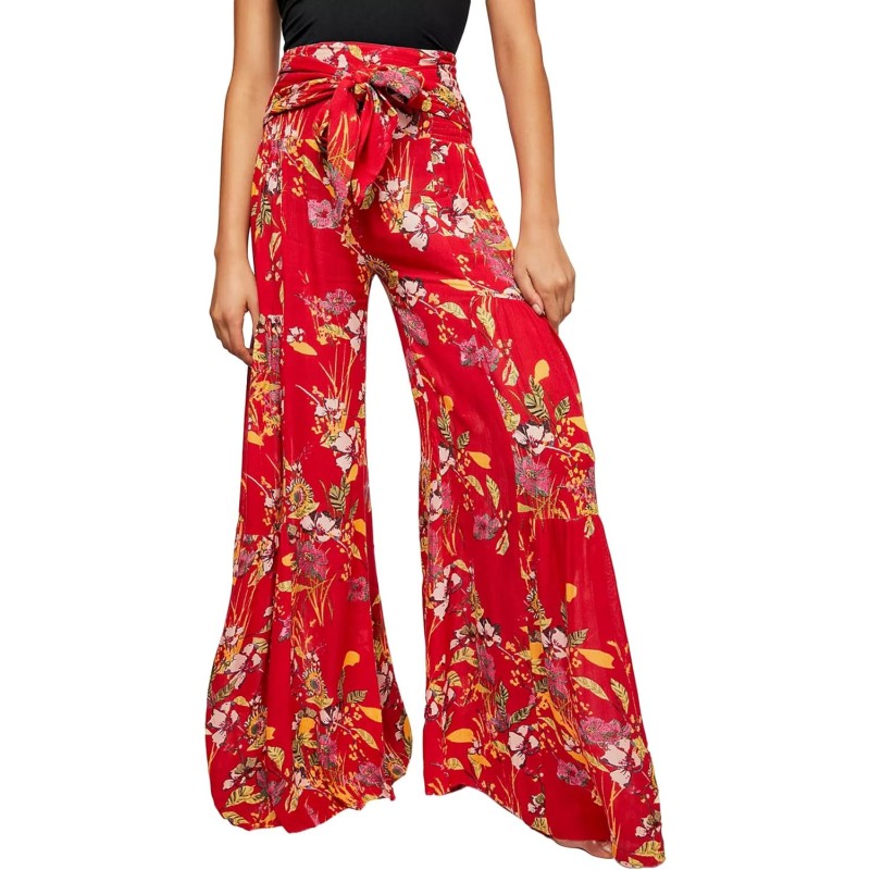 CHARTOU Women’s Comfy Boho Floral Print Beach Wide Leg Pants Elastic Tie Knot Palazzo Pants(Red)