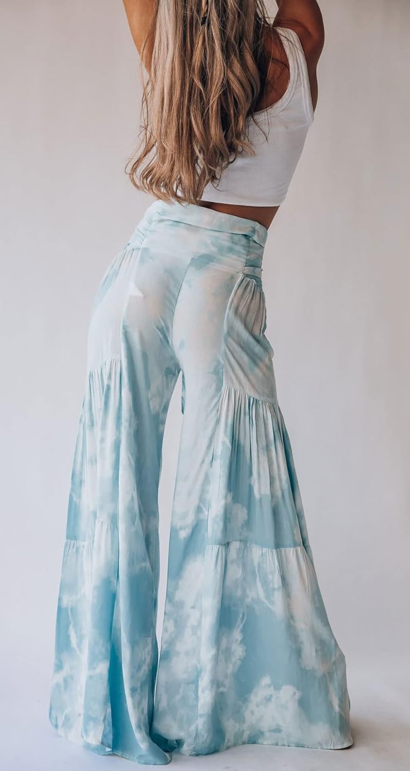 CHARTOU Women’s Comfy Boho Floral Print Beach Wide Leg Pants Elastic Tie Knot Palazzo Pants(Sky Blue)
