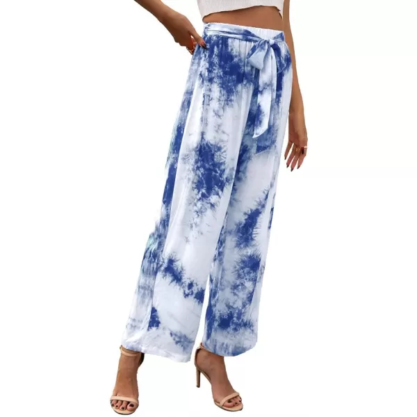 CHARTOU Women’s Comfy Elastic High Waist Belt Tie-Dyed Wide Leg Palazzo Beach Pants(Blue)