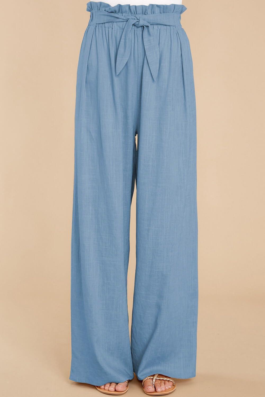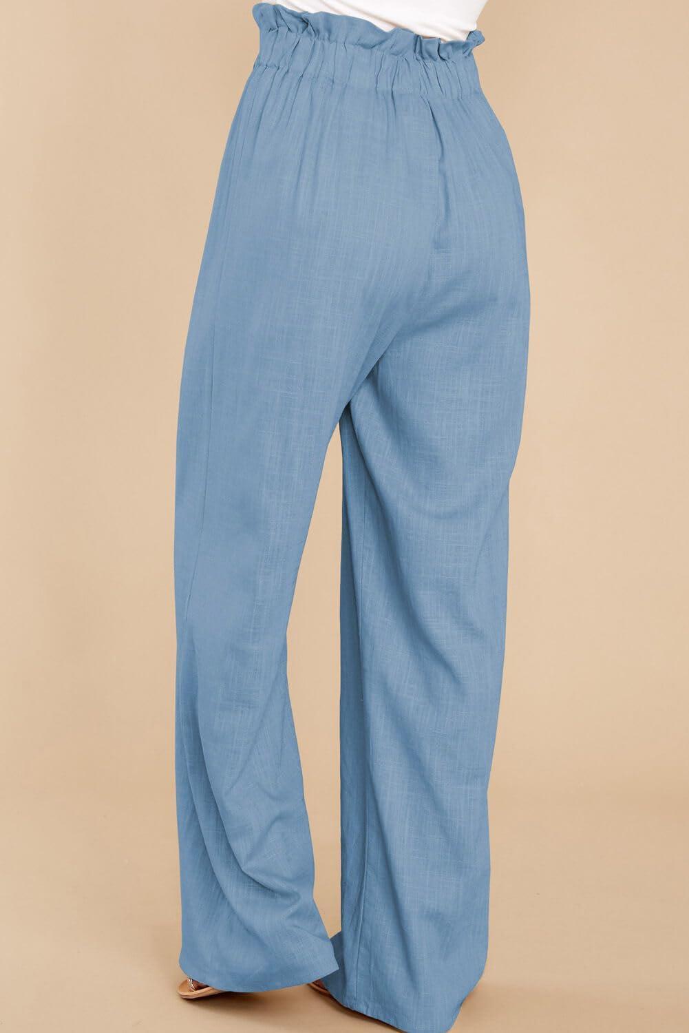 CHARTOU Women’s Cotton Linen Loose Fit Palazzo Pants Casual Elastic High Waist Wide Leg Paper Bag Pants with Pockets(Blue)