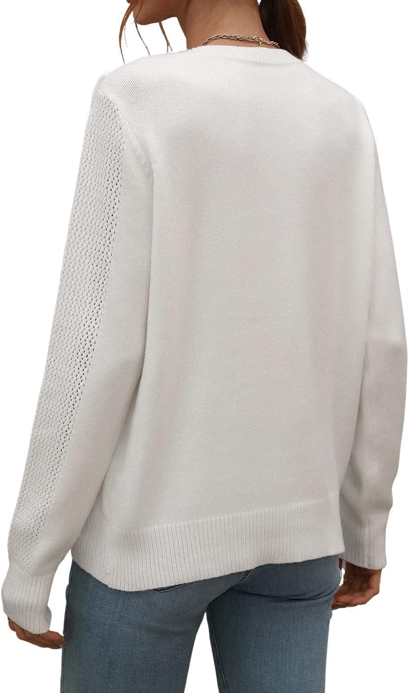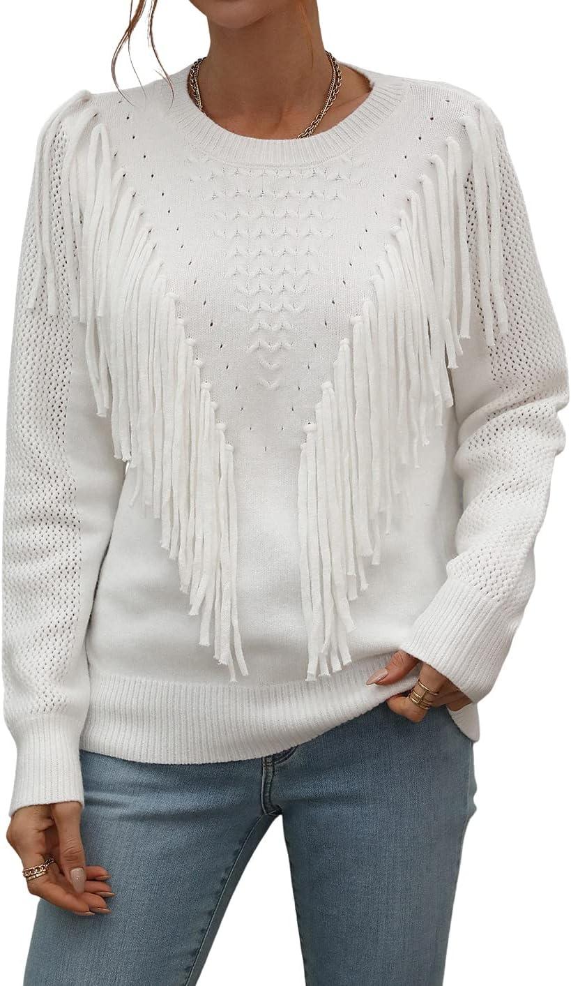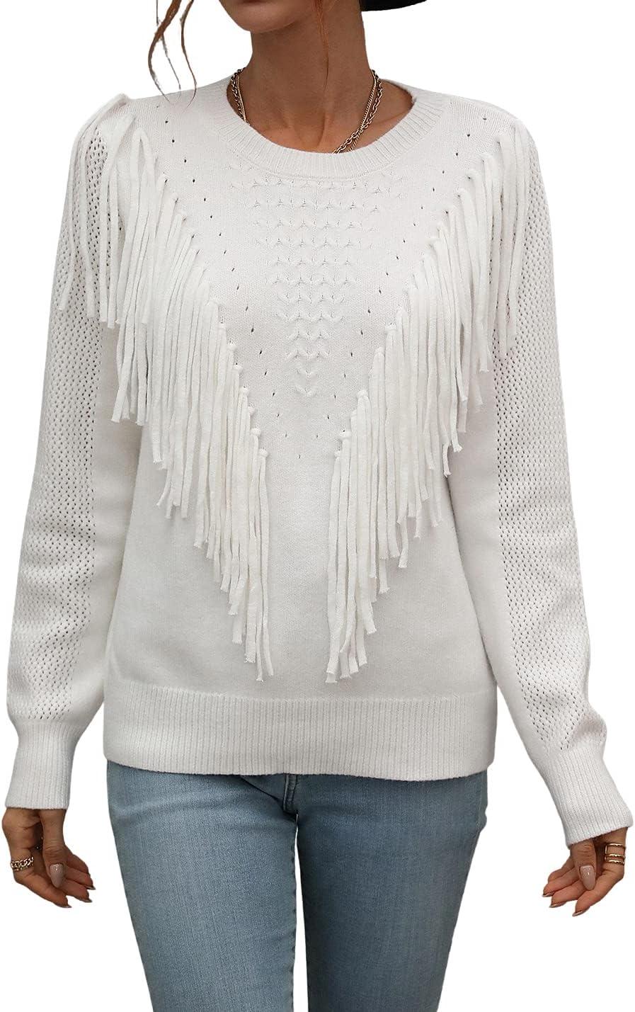 CHARTOU Women’s Crewneck Cable Pointelle Long Sleeve Tassel Fringed Knitwear Sweater Pullover(White)