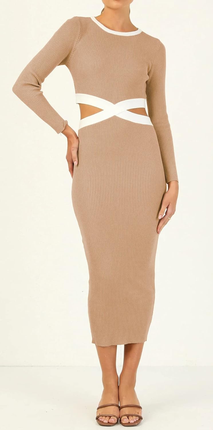 CHARTOU Women’s Crewneck Hollow Out Long Sleeve Bodycon Rib-Knit Basic Dress(Khaki)
