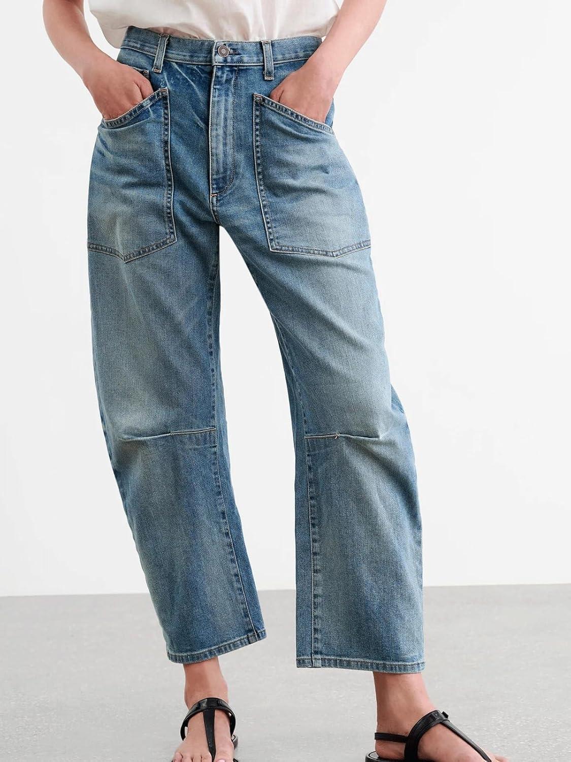 CHARTOU Women’s Cropped Mid Rise Barrel Jeans Pants Baggy Horseshoe Boyfriend Denim Pants Cargo Y2k Jeans(Blue)
