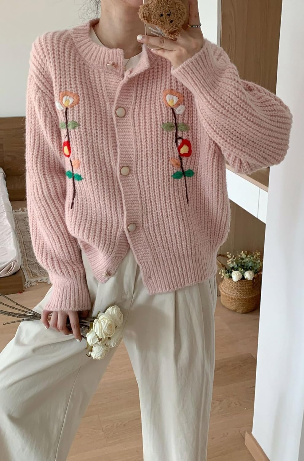 CHARTOU Women’s Cute Crew Neck Chunky Knit Floral Embroidery Open Front Cardigan Sweater(Pink)