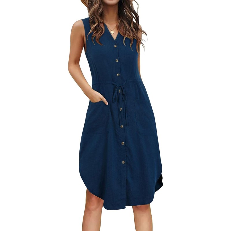 CHARTOU Women’s Cute Sleeveless Button Down Pocket Tunic Midi Dress with Drawstring(Dark Blue)