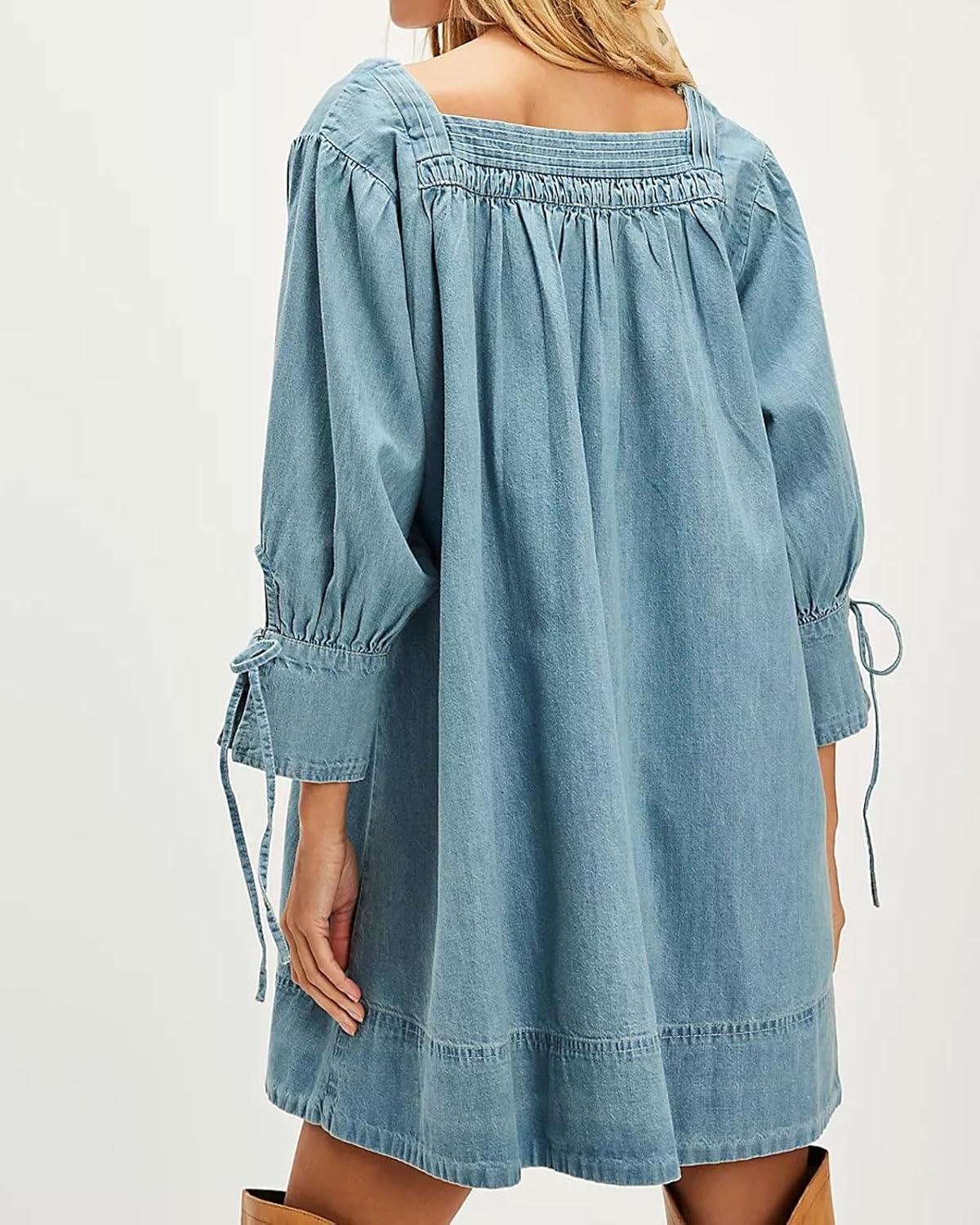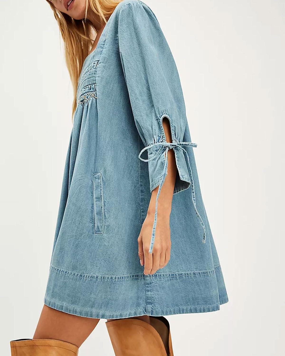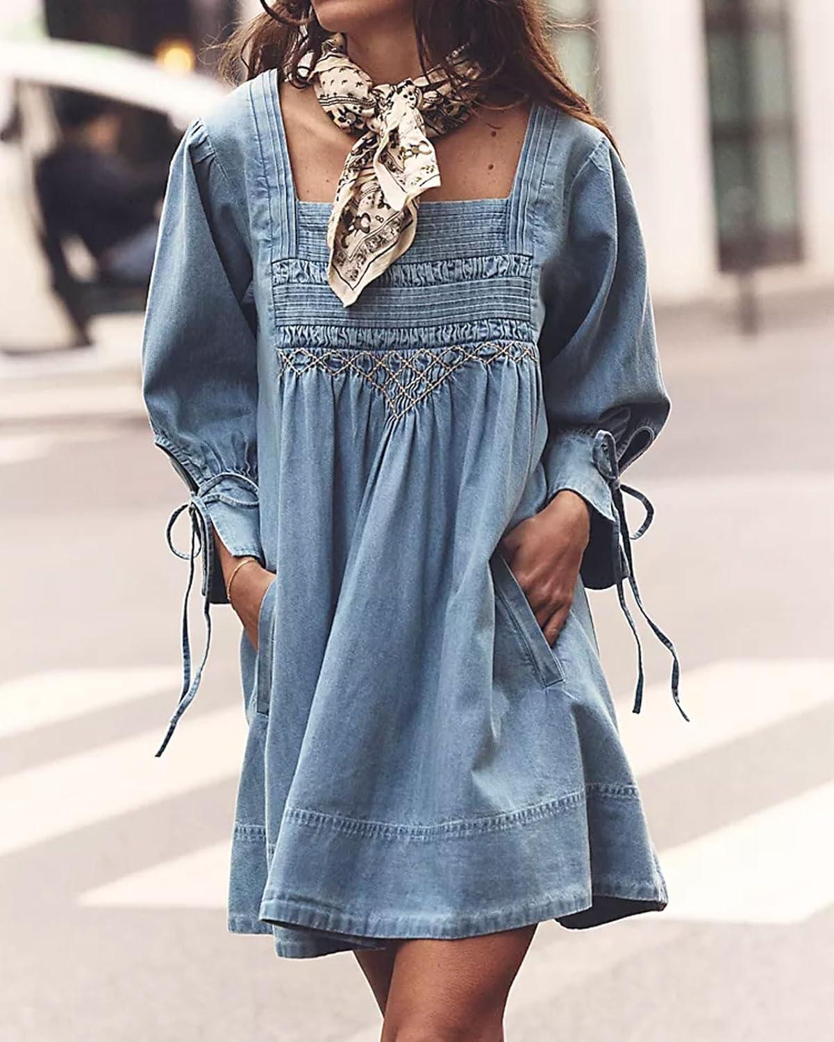 Womens Denim Mini Dress Cute Babydoll Jean Dress 3/4 Sleeve Smocked Loose Tunic with Pockets Casual fall jean dress for women 2025/ Stretchy square neck pleated dresses with bow tie cuff Women babydoll dress Loose fit short denim dress for women denim tunic Square neckline y2k dress smocked chic ruffle dress with big swing hem sweet puffer sleeve patchwork short dress A-line mini dress women square neck denim dress cute babydoll mini dress smocked bow tie tunic dress casual ruffle black jean dress for women loose fit smock denim tunic dresses fall puff sleeve jean mini dress pull on ruched khaki jean dress western cowgirl outfits