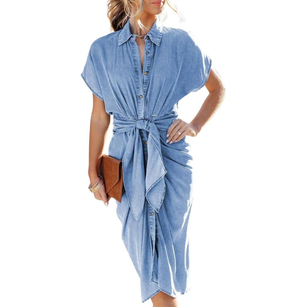 CHARTOU Women’s Denim Shirt Dresses Short Sleeve Front Tie-Knot Summer Elegant Blouse Dress(Blue)