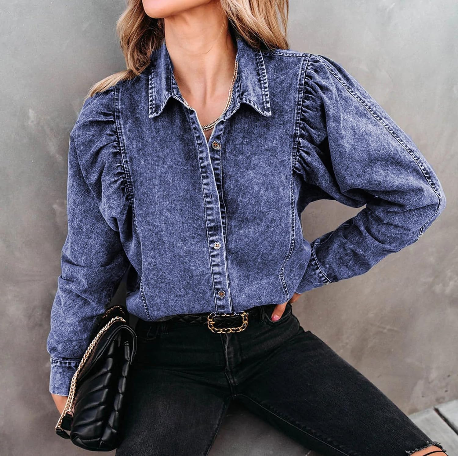 Women's Denim Shirts Vintage Collar Puff Long Sleeves Patchwork Button down Jean Shirts Casual Blouse Top