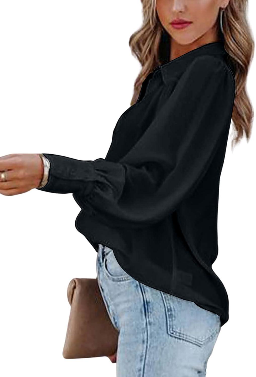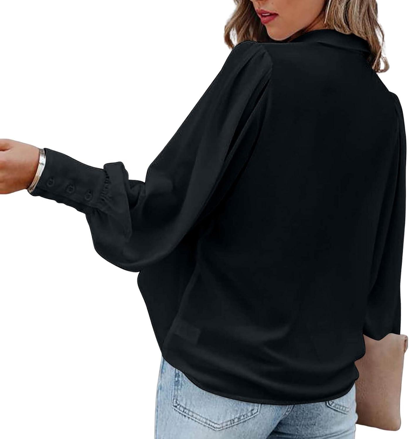 CHARTOU Women’s Dressy Casual Lapel Collar Pleated Lantern Sleeve Button Down Shirt(Black)