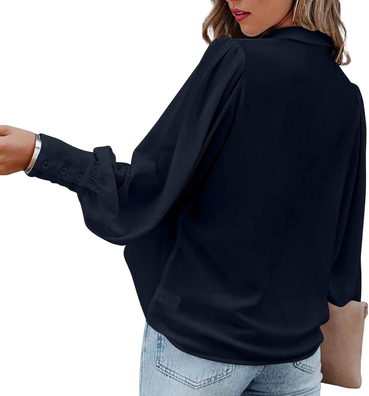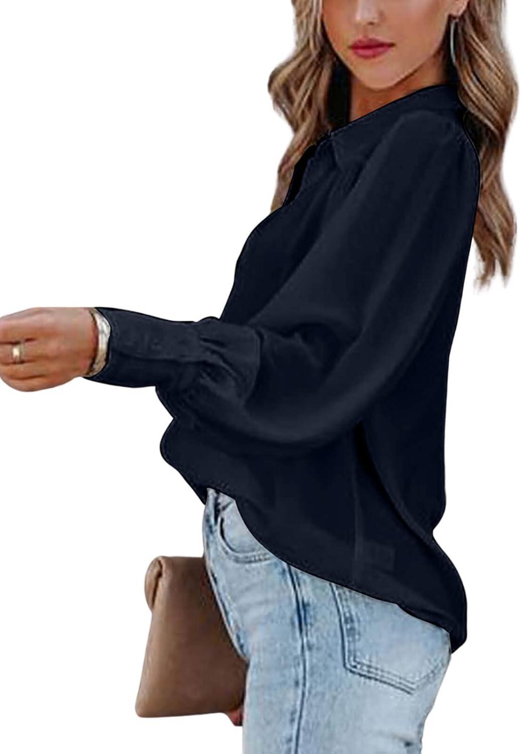 CHARTOU Women’s Dressy Casual Lapel Collar Pleated Lantern Sleeve Button Down Shirt(Navy)
