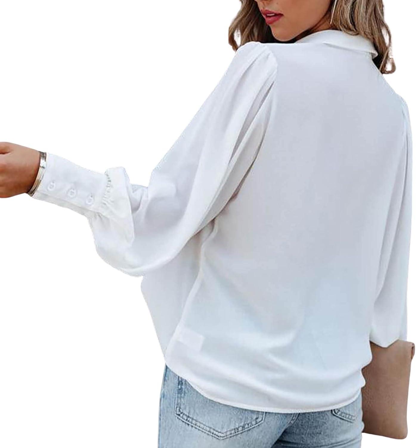 CHARTOU Women’s Dressy Casual Lapel Collar Pleated Lantern Sleeve Button Down Shirt(White)