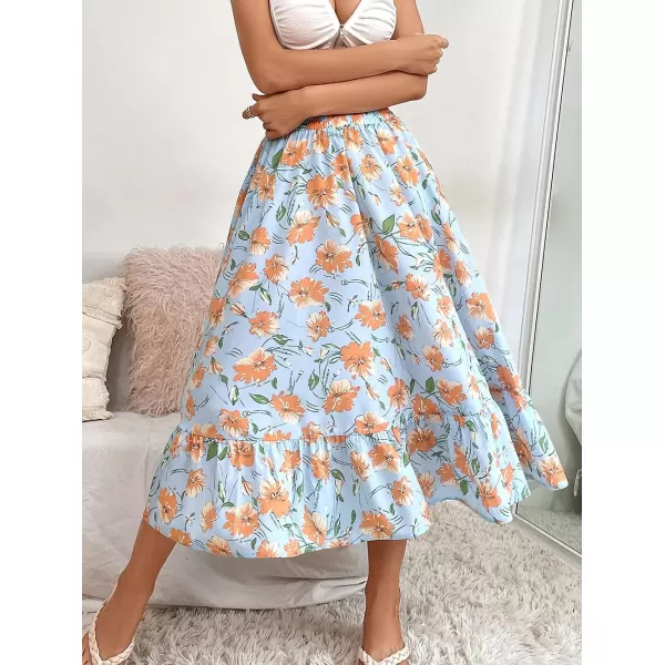 CHARTOU Women’s Elastic High Waist Floral Print Pleated Flowy Flared A-Line Midi Long Skirt(Blue/Daisy)