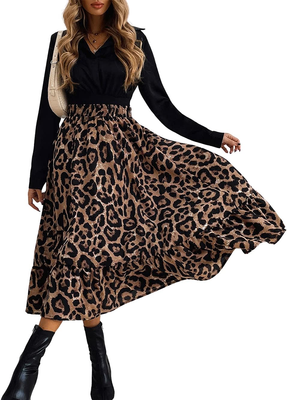 CHARTOU Women’s Elastic High Waist Floral Print Pleated Flowy Flared A-Line Midi Long Skirt(Cheetah/Brown)