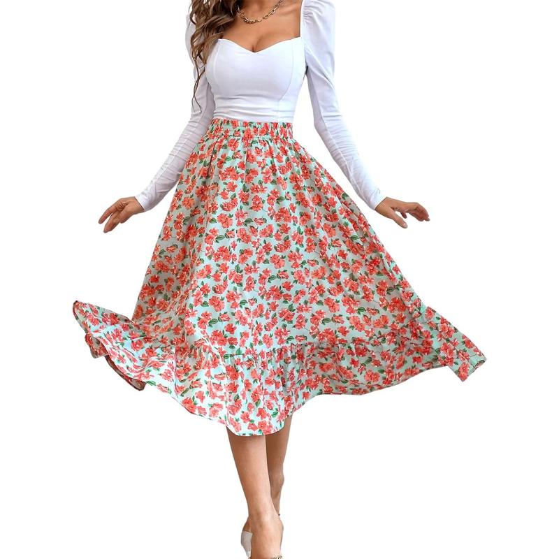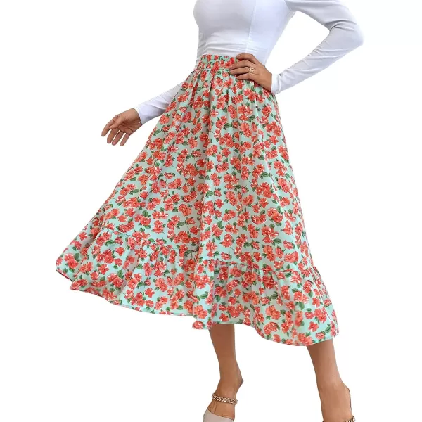 CHARTOU Women's Elastic High Waist Floral Print Pleated Flowy Flared A-Line Midi Long Skirt
