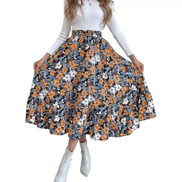 CHARTOU Women’s Elastic High Waist Floral Print Pleated Flowy Flared A-Line Midi Long Skirt(Black)