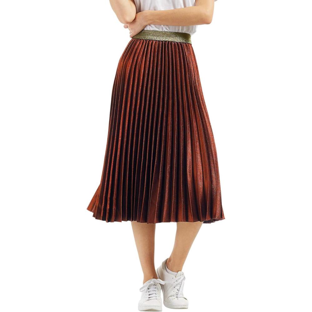 CHARTOU Womens Elastic-Waist Accordion Pleated Metallic Long Party Skirt(Caramel)