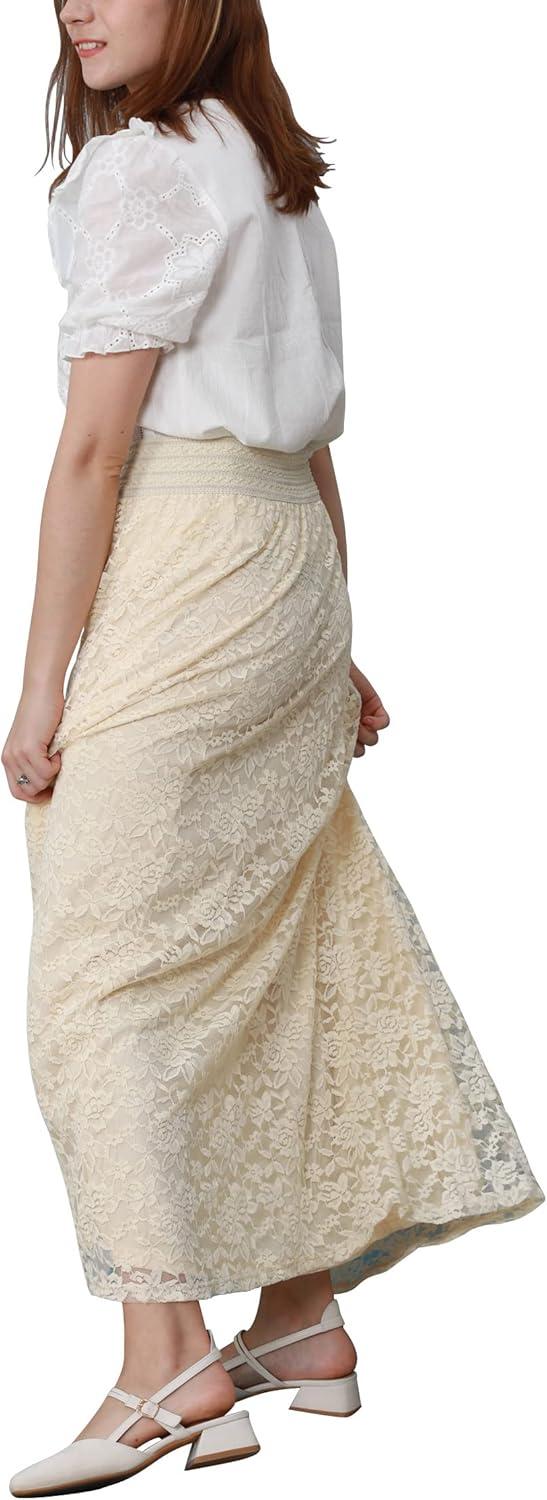 CHARTOU Womens Elegant Floral Lace Elastic High Waist Pleated Maxi Long Beach Skirts(Beige)