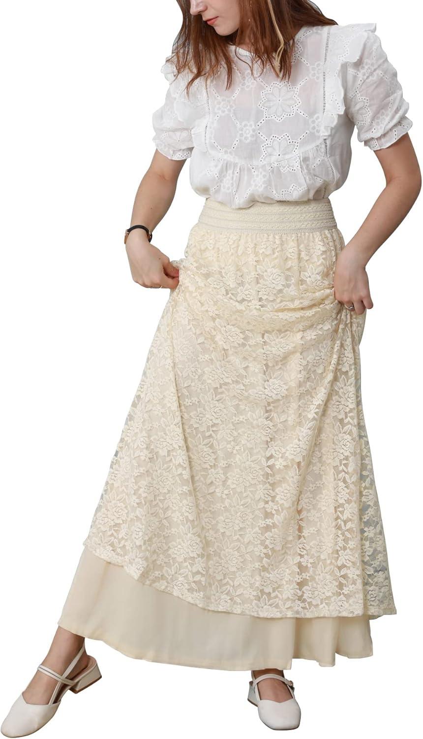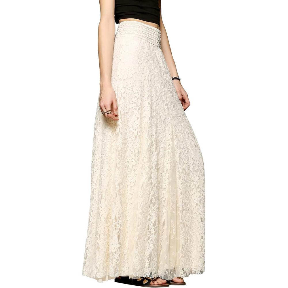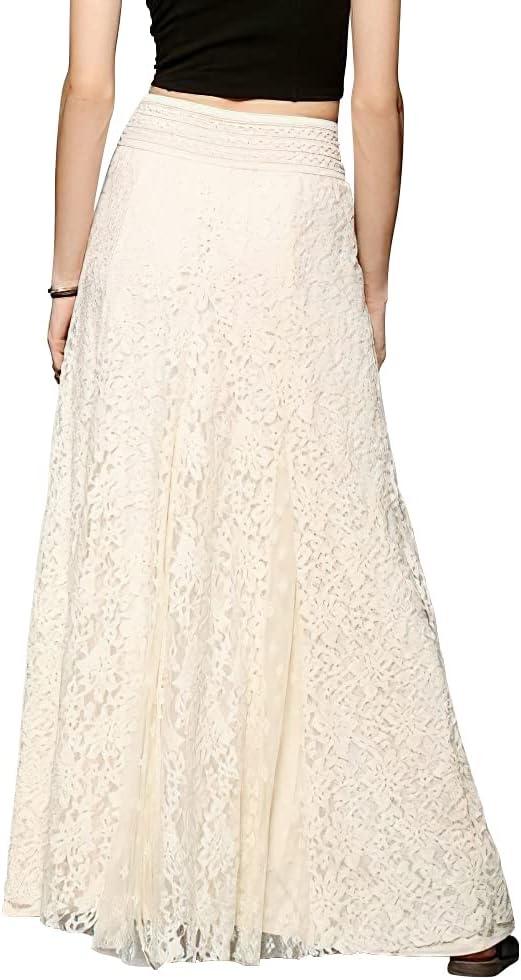 CHARTOU Womens Elegant Floral Lace Elastic High Waist Pleated Maxi Long Beach Skirts(White)
